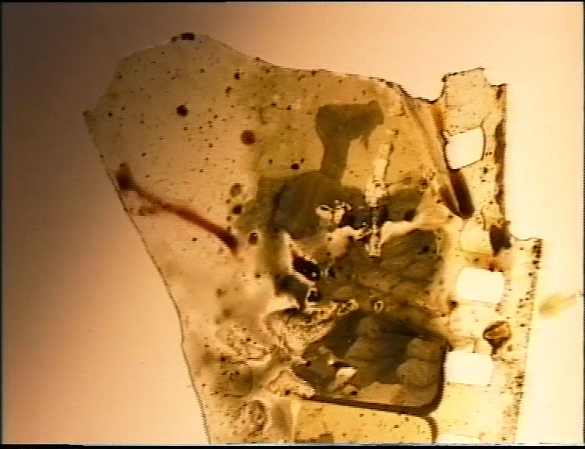 For their short film Trasparenze (Transparences, 1998), the artists filmed themselves at work, crafting the footage that they would use as a jumping-off point for their own narratives. On the screen, we see an old, damaged bit of film reel, its perforations torn, the frames streaked, flecked with discolorations, some ravaged beyond repair or legibility. It seems the reel is the wall of a cave which some ancient tribe covered with symbols that no one can truly translate anymore. Meanwhile, these materials, tangible traces of decay, are the product of time and its inevitably devastating impact. From the colorful flecks and streaks emerges, from time to time, a fragment of someone’s figure, whose presence is remarked upon by Yervant Gianikian as he utters the words “una figura.” There is nothing obvious, however, in the childlike effort to identify basic elements of the image (“here is a group of soldiers, they’re standing in the snow”) — their presence is the product of the work of acknowledgement which stands against the friction of time. It comprises not only the careful observation of archival footage of a given historical event, but also the work of the imagination, similar to what Gianikian does when he compares a red streak on one of the frames to a bloodstain. It becomes apparent that man is not the sole figure [figura] in the narrative; the other is a splinter of matter whose shape pulls our gaze into a game of similarities and dissimilarities.20 History sees animate and inanimate objects as equally important, and the filmic narrative is supposed to oversee their encounter. Contrary to what the title might suggest, archival footage featured in the film is not transparent, because it is part and parcel of a history of violence, is forever tainted by cruelty and suffering, and one cannot imagine a contemporary reading of such footage that would not include a reference to those who were forced to suffer this violence.