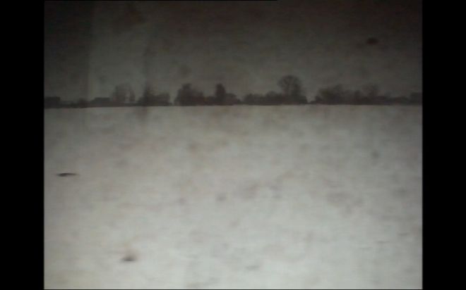 The first film in the cinema-installation that allows one to speculate about the identity of the post-witness is Postcards. We are shown twelve slides, black and white, nearly indistinguishable, with generic winter-time images of a rural landscape: buildings visible in the distance, sometimes dirt roads, sometimes clumps of trees. The photographs move back and forth in front of our eyes – the video runs uninterrupted, yet the principle of the repetition is peculiar: the circular form of the projection, typical of this cinema-installation (and many other of Bałka’s works) is absent, the returns occur somewhat to the rhythm of a pendulum. Back – and forth; back – and forth. Thus, the viewer is captured in a space between point 1 (rural buildings in the background, a pole and power lines in the foreground) and point 12 (a dirt road with buildings in the distance, nearly unrecognisable). The images bear a resemblance to familiar views from the window of a train on a journey through central Poland: a monotonous landscape, overcast sky, no hills in sight. The shots are strikingly similar to those filmed by Andrzej Brzozowski in the opening section of one of the most shocking Polish films about the Holocaust. The thirteen-minute-long piece By the Railway Track (Przy torze kolejowym, 1963), based on a story by Zofia Nałkowska from her collection Medallions, begins with a sequence of nearly identical landscapes seen from the window of a train. In Bałka’s work, the views change rhythmically more or less every two seconds, while the silent sound of the image recording device underscores the nearly regular rhythm, which in Brzozowski’s film was determined by the clatter of train wheels. The views in By the Railway Track and Postcards share the same light, the same distance between the observer and the horizon and the same objects in the field of vision.