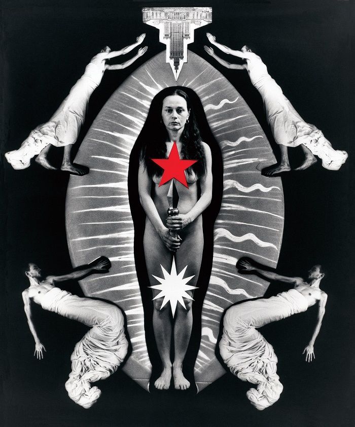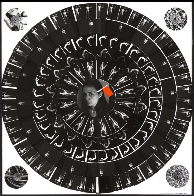 Zofia Kulik, Self-Portrait with a Flag (Mandala), 1989, black-and-white multiple exposure photograph, 50x50 cm, courtesy of the artist
