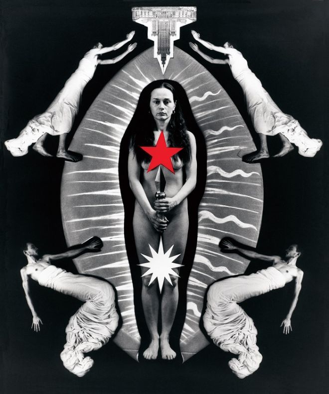 In comparison with the versions created in 1997, there is one more significant change here: in the first three, a sickle was placed to the left of the artist’s head. This looks like an emblem on a wall, probably taken from the communist symbol of worker-peasant alliance (the hammer and sickle). Kulik’s art from the turn of the 1990s has been unanimously recognized by art critics and historians as referring to totalitarian systems, usually to communism and the way the individual functions within it. “If the critical dimension of Kulik’s photomontages extends beyond the parameters of the Communist era to the present, it is then precisely insofar as they acknowledge and examine the after-life of the Soc-Age’s idioms in the post-Communist psyche,”27 observed Ewa Lajer-Burcharth. Another scholar, Piotr Piotrowski, assessing the validity of Kulik’s observations, saw them as being aimed at the post-communist system rather than the post-communist psyche. He was convinced that the fall of communism did not actually entail the regaining of freedom, and he highlighted this explicitly in the text where he analyzed Kulik’s works: “It would be naive to say that the societies of Eastern Europe are now free. If they are free, then they are only free from Soviet domination. The destruction of the Leninist-Stalinist state has been paradoxically accompanied by the revival of old demons such as nationalism, xenophobia, and intolerance, which could pose a much greater threat to our freedom than the presence of soldiers with five-pointed red stars on their caps.”28 As Piotrowski and Kulik would probably agree, the Catholic Church was responsible to a great extent for the “revival of old demons.” This has not been stated directly in any of Kulik’s interviews (while Piotrowski wrote about it multiple times), but we see her criticism expressed in multiple ways in her works. In The Splendor of Myself, the most visible aspect of this is the cross made of male nudes that Kulik situated on the opposite side of her head, as an element corresponding with the sickle.29