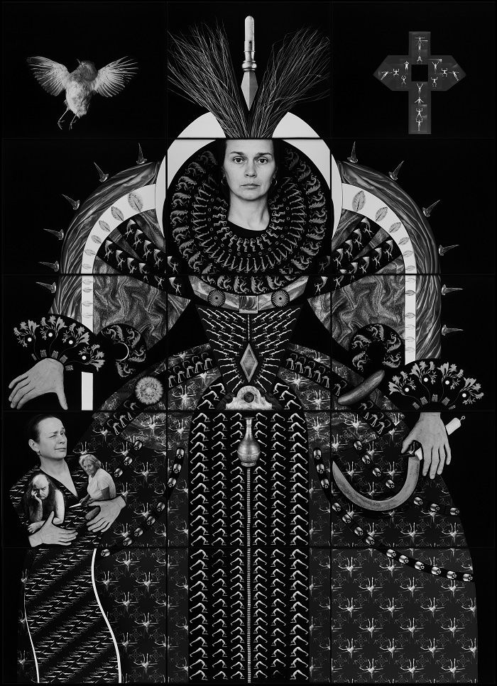 In The Splendor of Myself V the cross remained in place, but instead of a sickle there is a dead bird to the left of the artist’s head, and the sickle now sits in the artist’s left hand. This becomes a dangerous object in the hands of a proud queen – a tool in the hands of a woman who is presented not as being subjugated to the sickle, but able to utilize it. The translocation of this element strengthens the image of Kulik as a woman in power that was already present in the first versions of The Splendor of Myself. In a similar way, we could read it as the taking over of a political weapon, but now – in 2017 – it seems to lose its political dimension. The artist explains that the sickle was “bought in a garden shop,” yet had “never been used in a garden,”31 but to use this as an argument would be false, as many elements from her immediate, private surroundings acquire political meaning in her works. The change rests more in the confrontation, in the work, of the sickle and a “family portrait” that may suggest battles other than political ones. This corresponds with a transformation that is visible in her art in more general terms, which became much less political at that time; series such as Patterns32 or the piece Garden (Libera and Flowers) include no political elements.
