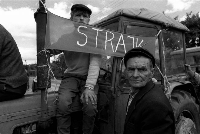 Some of the roadblocks were cleared in a matter of hours, while others stayed in place for days, sometimes even weeks. Held either across individual voivodeships or countrywide, they were usually accompanied by appropriate props. “Holding scythes and hatchets […] the farmers blocked the Włocławek-Toruń section of State Road No. 1” in June of 1992.47 In Świecko, “farm workers armed with scythes with their blades fixed like bayonets overran the cargo terminal, blocking border traffic using harrows, potato diggers, barbed wire, and tires.”48 The farm machinery used in the roadblocks was covered in slogans addressed to drivers awaiting passage: “Workers, do not stand against those who feed the nation.” Each blockade had its own rules: some had a schedule for letting cars through, others granted passage only to emergency vehicles, cars carrying children, or people driving to medical appointments. Many became places for meetings and conversations. In February 1999, a Gazeta Wyborcza reporter wrote: