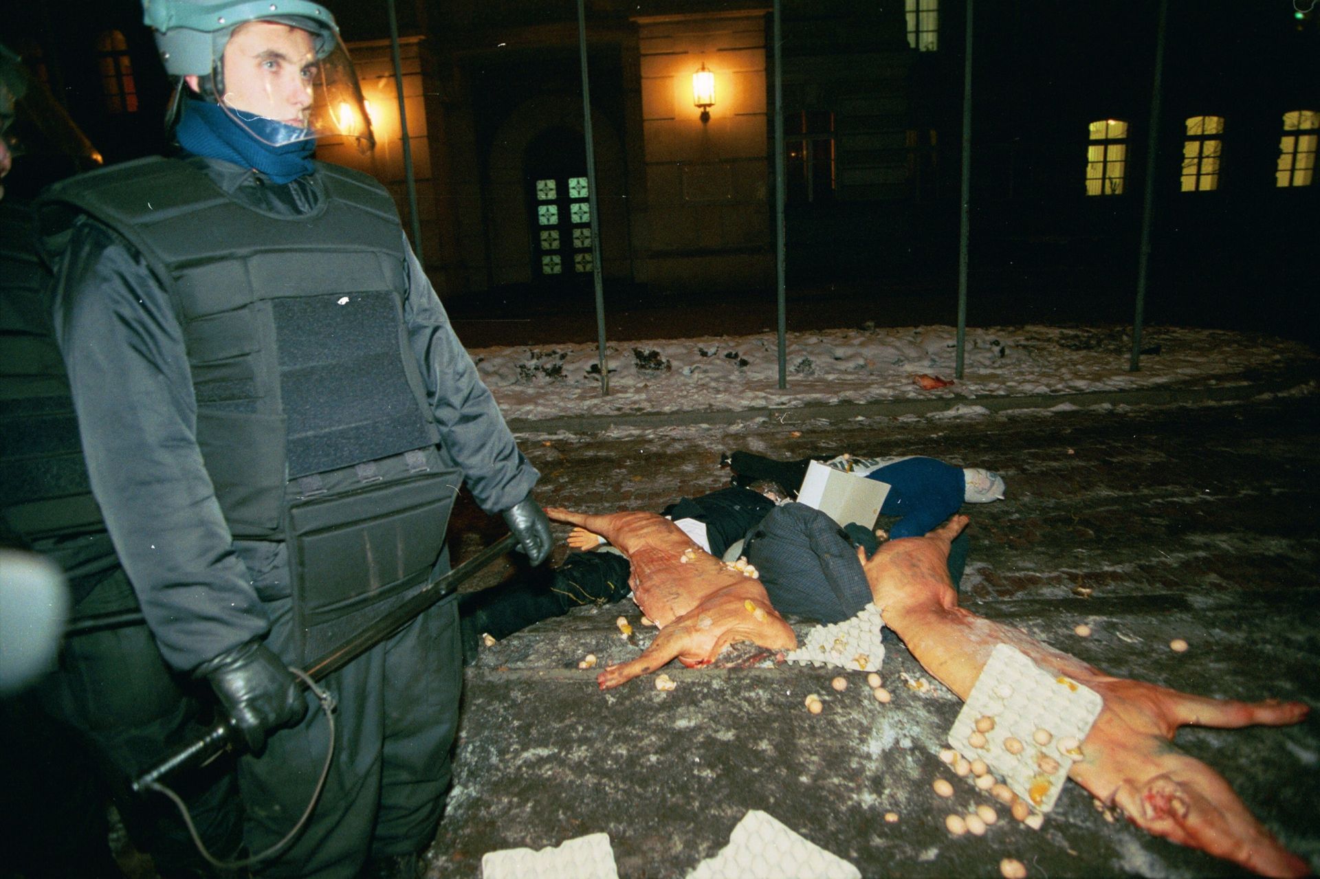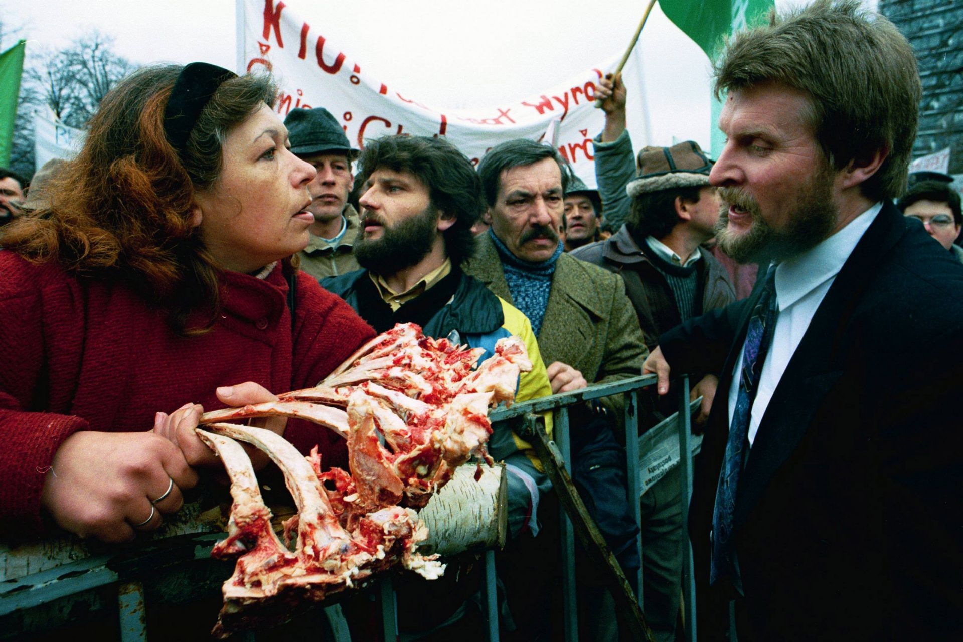 Other “vernacular sculptures” often appearing at demonstrations involved animal remains – heads, ribs, and other bits of carcass. Pig heads were dressed as politicians – first anthropomorphized, then stuck on pikes and painted red. Ribs became banners, carried high over protesters’ heads, or a menacing prop demonstrating class affiliation. The presence of butchered meat at a protest – although less shocking in the 1990s than today, mostly due to the fact that, at the time, meat was routinely sold off folding tables on the streets – became part of the vernacular of excess, eagerly used by protesting farmers.