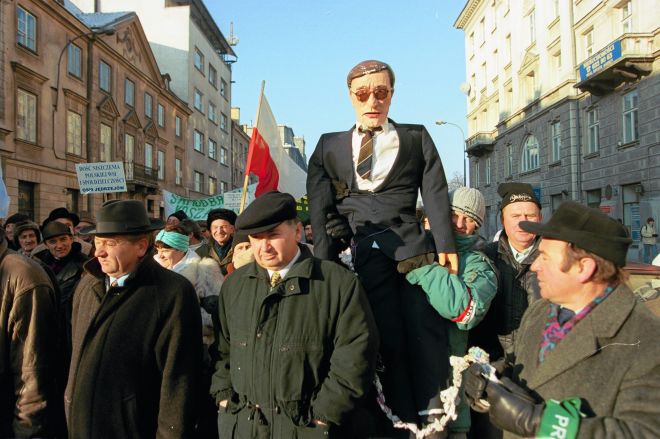 Produced in large quantities by the protesters and routinely subjected to violence, the effigies differed in terms of make and material – ranging from the most realistic-looking, boasting carefully painted papier mâché heads and dressed in a suit, tie, and dress shoes, to sacks covered in fabric with faces drawn in black felt-tip pen, or human shapes cut out of styrofoam. They were either made to resemble specific individuals – Leszek Balcerowicz being the most frequent choice – or left vague enough to represent broadly defined government authorities or “elites.” The props were subjected to ritual humiliation – kicked, torn apart, and set on fire – simulating actual violence being meted out to the individuals they represented. The symbolic act provided an outlet for pent-up class rage. Although routinely insulted and verbally abused, government officials were never physically attacked when they stepped out of their offices to speak with protesters. Spectacles involving the effigies drew interested observers, protesters and bystanders alike, thus re-enacting the rural – sometimes controversial69 – traditions of public effigy burning.