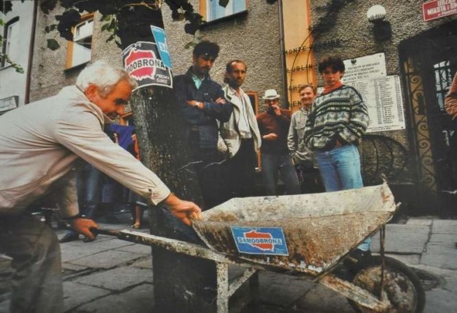 In August 1993, Samoobrona activists lent their support to the striking people of Praszka, a city in the Opole voivodeship, where downsizing at the Polmo automotive plant had resulted in the dismissal of a large portion of its workforce.31 At one point, protesters breached the town hall offices and captured the mayor of Praszka, affiliated with the Democratic Union party (and an erstwhile employee of the restructured facility, which made him a former co-worker of the protesters), parading him out of the premises in a wheelbarrow covered in Samoobrona stickers. The stunt drew considerable outrage from politicians and reporters. The protest in Praszka continued for twenty more days, during the course of which the mayor was forced to resign, the city was plastered with banners and flags, and various city offices were blockaded and occupied, with the protesters demanding that no cuts be made to unemployment benefits and the city be included in the official list of towns at particular risk of rampant unemployment and thus eligible for additional state-funding.