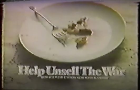 The Video Art exhibition, as has been mentioned, featured advertisements. One of them was Andy Warhol’s Underground Sundae (1968), produced for the Schrafft diner chain [fig. 3]. As one would expect for a frozen dessert ironically described by Warhol as “underground” (i.e. uninterested in commercial circuits), the work plays with the codes of advertising rather than reproducing them – the soundtrack records the film being shot, color test bars are visible in the background. In the exhibition catalog, this “artist’s advertisement” enjoys a special status in comparison to other ads: the catalog gives relatively detailed information (format, sponsor, lender) in the same arrangement as for other videos or installations shown in the exhibition. The “anonymous” ads, on the other hand, are ostracized and crammed into a generic “Commercials” section, designated on the basis of rudimentary information (title and date only). One of these ads, Help Unsell The War (1972) [fig. 4], may provide a perfect example of what John McHale is interested in in these advertising works, an interest relative to the symbolic significance of metaphors produced by television within society.