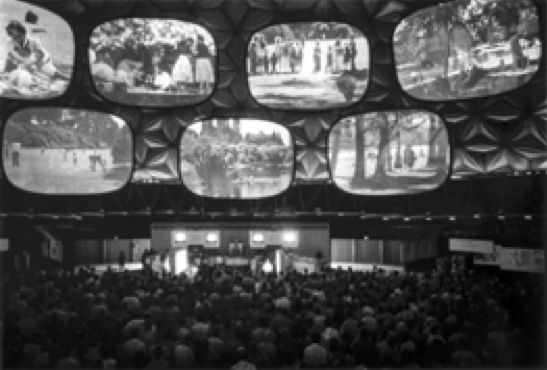 Fig. 7. Charles and Ray Eames, immersive installation Glimpses of the U.S.A., 1959. 12’, seven screens (each 20 x 30 inches). Installed in a geodesic dome created by Richard Buckminster Fuller, Moscow World’s Fair, 1959. Image used by Richard Hamilton in “Glorious Technicolor, Breathtaking Cinemascope and Stereophonic Sound”. © Charles and Ray Eames