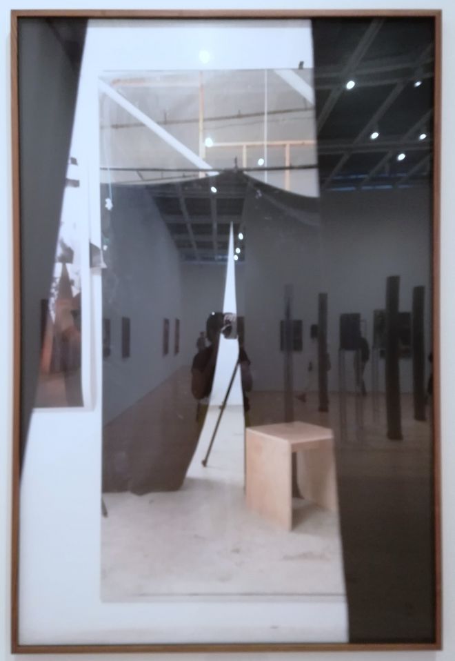 In one of my pictures, a shot of Drop Scene (0X5A1987), I saw my reflection in the protective glass covering the work, my figure clearly visible against the black drape hanging in the middle of the composition. The rectangular shape of the phone lined up almost perfectly with the camera in the work. It was only then that I realized Sepuya’s photograph itself portrayed a scene reflected in a mirror. My shape was the sum total of the many multiplied reflections. The sense of being observed at the Whitney, however, was illusory. In reality, Sepuya and Goldberg were instead looking at each other, while I was followed by the reflection of the lens. The artists blurred the boundary of the picture so successfully that it was almost impossible to resist the reflective illusion.