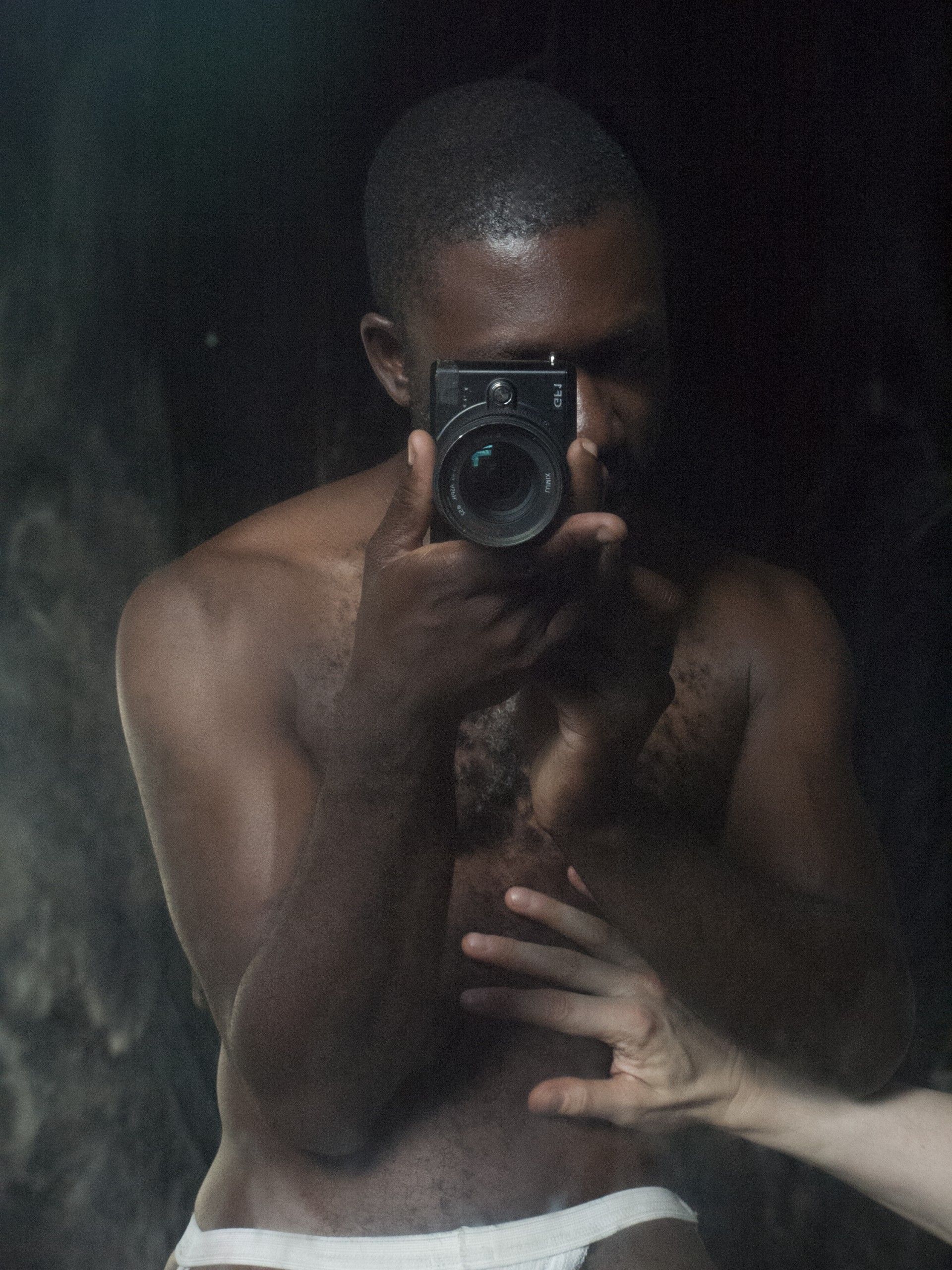 2017’s Darkroom Mirror (2090183) depicts the artist photographing himself in a mirror, with the hand of his partner also in the shot. The half-naked Sepuya, clad only in his underwear, is situated center frame. The picture shows him from the hips up, against a black curtain. While the photographer’s right eye looks through the viewfinder, the left remains shrouded in shadow. The viewer cannot know whether it is closed so as to allow the other eye to focus, or still observing the scene being photographed. The prominently displayed lens serves as the artist’s metonymic eye. The rectangular body of the camera enters into dialogue with the vertical format of the photograph, creating a sort of picture-in-picture. Furthermore, the artist holds the camera in his right hand, wrapping his fingers around it. The thumb, index and middle fingers create a bodily frame around the lens, completed by the upper edge of the camera body. This hyper-prominence of the camera elevates it to the status of an iconic medium, framing the work and being framed within it. The lens, clearly protruding beyond Sepuya’s index finger, transcends the inner frame produced by the gesture of the artist’s hand.