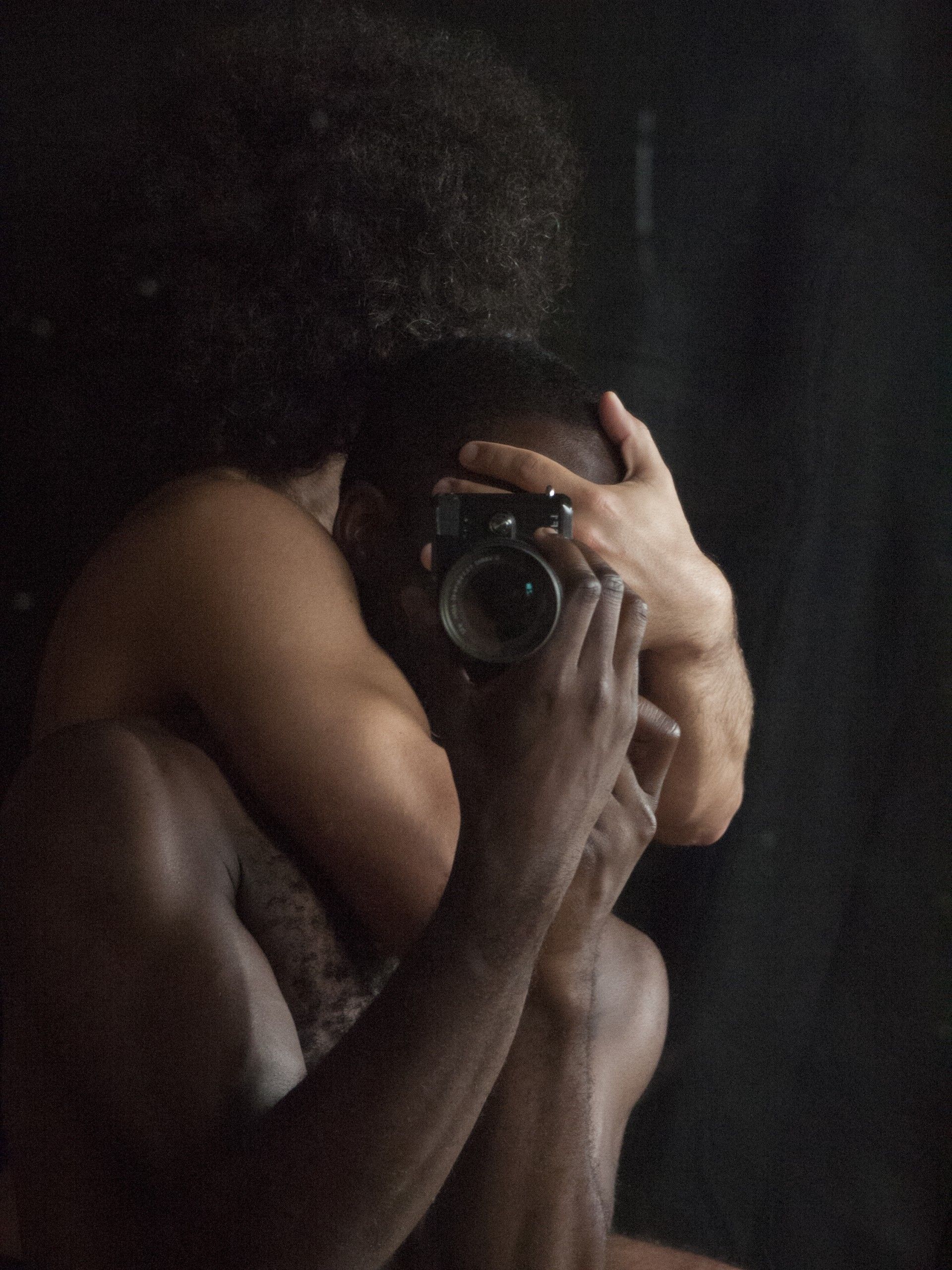 The 2017 photograph Darkroom Mirror (_207386) considerably complicates the relationship under discussion. In the frame are two men – Sepuya and his partner – pictured from the waist up. The artist holds the camera, with the lens once again placed center frame. Sepuya’s partner remains unidentified – his face is turned toward the black fabric and only his bushy hairstyle may provide a clue to his identity. The man holds the Sepuya in a firm embrace, with his arms around his neck and his hands over his face. With his eyes covered, the photographer cannot look through the viewfinder, and is thus prevented from seeing the shot he lined up. Because his vision is physically blocked, the camera lens remains the sole source of gaze in the picture.