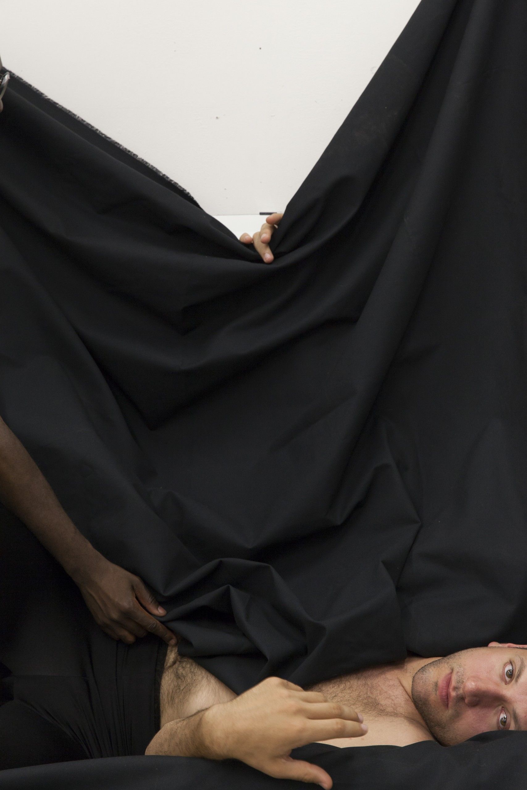 The 2016 Darkroom (_MG_9226) balances somewhere between intimacy and theatrical staging. The picture can easily be read as a thoughtful self-portrait alluding to such classics as Jacques-Louis David’s The Death of Marat (1793). The artist pulls back the curtain to reveal a white man lying on the floor, whose indifferent face, slightly parted lips, and wide-open eyes suggest a dead body. It might seem that the audience is witness to a death scene, or its staging, to be more precise. The man’s gaze is absent, his chest is naked, while the unnaturally posed hand, touching the edge of the photograph, symbolizes the line between life and death. The hand of the man in the background, portrayed in the upper portion of the picture, reveals the studio and a small, barely visible fragment of mirror hanging on a white wall, indicating that we are dealing with the many planes of Sepuya’s atelier. The first is hinted at by the artist himself, as his hand enters the shot from outside the frame; the body of his prone partner is somewhere between the stage and a backstage area, the existence of which is implied by the hand of the man in the background. Like a director controlling a mise-en-scène, Sepuya preserves within the confines of the shot a photographic performance unfolding over time.41 The meticulously draped curtain in the center of the shot serves two functions: it fills space and partitions the atelier into two realms – one visible to the audience, and another available only to the persons portrayed in the photographs; it is a metaphor for the veil, shaping the visibility of the racially defined subject of the work.