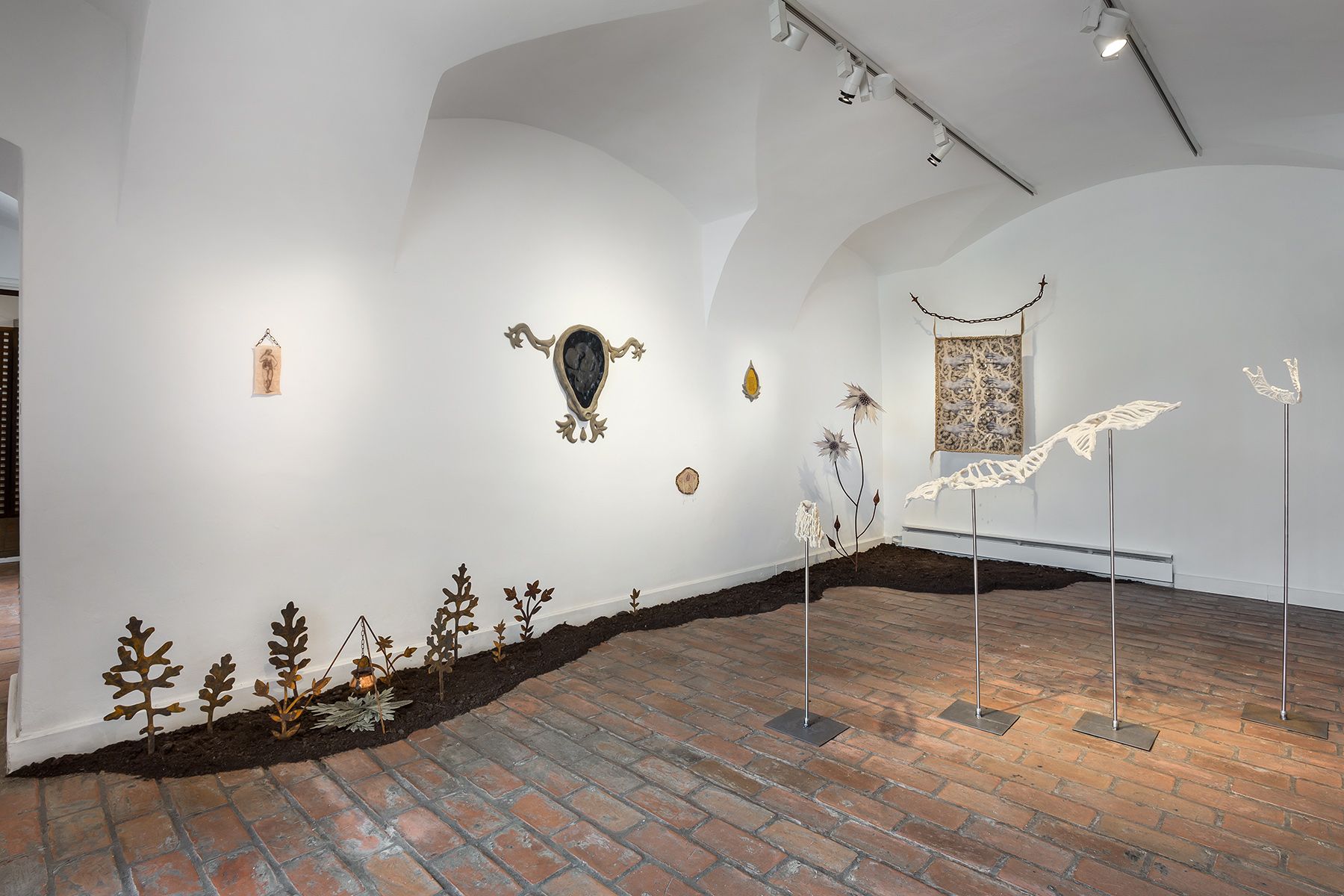 For the Budapest Gallery exhibition, the duo further developed their piece Gazing at the Stars and the Moon, focused on the history of Hungarian witch trials. Their starting point was the Malleus Maleficarum, the infamous misogynist volume published in the fifteenth century by inquisitors. One part of their installation, a banner-like textile piece, features an archival image of a naked woman with her face obscured – highlighting how the male gaze sexualized and objectified women. It is also a reference to the Maleficarum, where it was described in detail how women took part in orgies with the Devil and performed various unacceptable activities. These false accusations also appear, on parchment-like objects, in the exhibition space. However, they are not general accusations, but are connected to a specific woman who lived in Hungary and was accused of being a witch. The artists researched the seventeenth-century Hungarian witch trials, using the indictment of a certain Mrs. Gergely Szabó, charged in 1681 in Debrecen and later killed in a brutal way. She was accused of “gazing at the stars and the moon” and “befriending the Devil.” The former connects not only to ideas of weather prediction and transformation, but also to healing practices rooted in seasonal changes and to learning about women’s natural cycles and rhythms. Thus, the installation can be seen in a way as a memorial to Mrs. Szabó while shedding light on her true activities. The other textile, presenting a series of hands, can be associated with help / aid / support, while the usage of hemp is connected to folklore and artisanal techniques. Furthermore, the installation appears as a garden, where flower- and plant-shaped objects spread out from the wall and emerge from the soil-covered gallery floor, as if growing there.