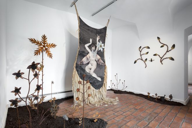 Jana Zatvarnická, Imagining a Herbarium, 2023 (right) and Ana Likar, She Made Storm, 2022, group exhibition "Maleficae - from Bonfires to Digital Witchcraft", Budapest Gallery, 21 June – 8 September 2024, curated by Flóra Gadó, Júlia Hermann and Dalma Eszter Kollár, installation view. Photo: Tamás G. Juhász