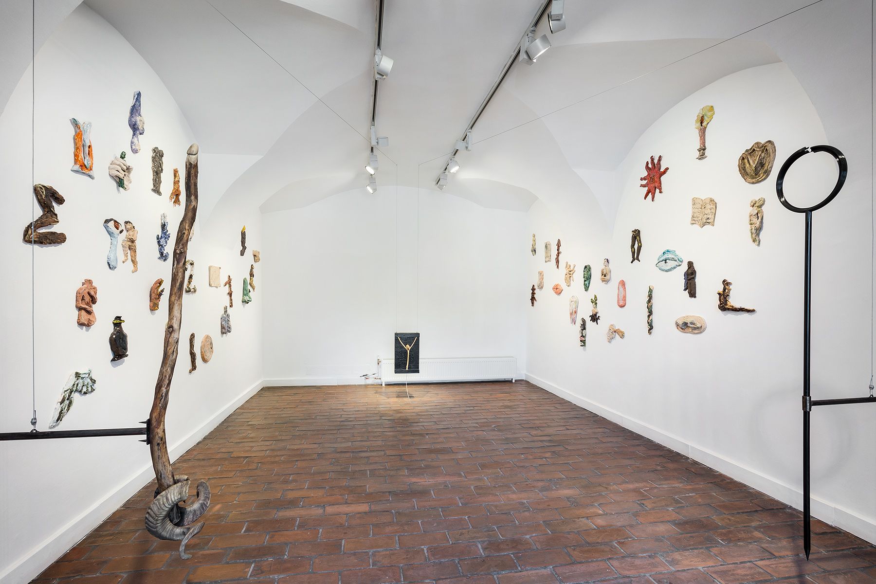 Another plant highly visible in their installation is deadly nightshade (Atropa belladonna), which contains the powerful sedative atropine. In large doses, atropine causes heavy sweating, vomiting, respiratory difficulty, hallucinations, coma, and death. It is widely believed to be one of the key ingredients in witches’ flying ointment, as described both by Szpila in her novel and by Lawrence.34 The artists “chain” a belladonna-shaped object to the wall, highlighting its dangerous aspects. The piece is also positioned close to the first textile work with naked women, once again connecting the meaning of the name belladonna to the sexualization of women.