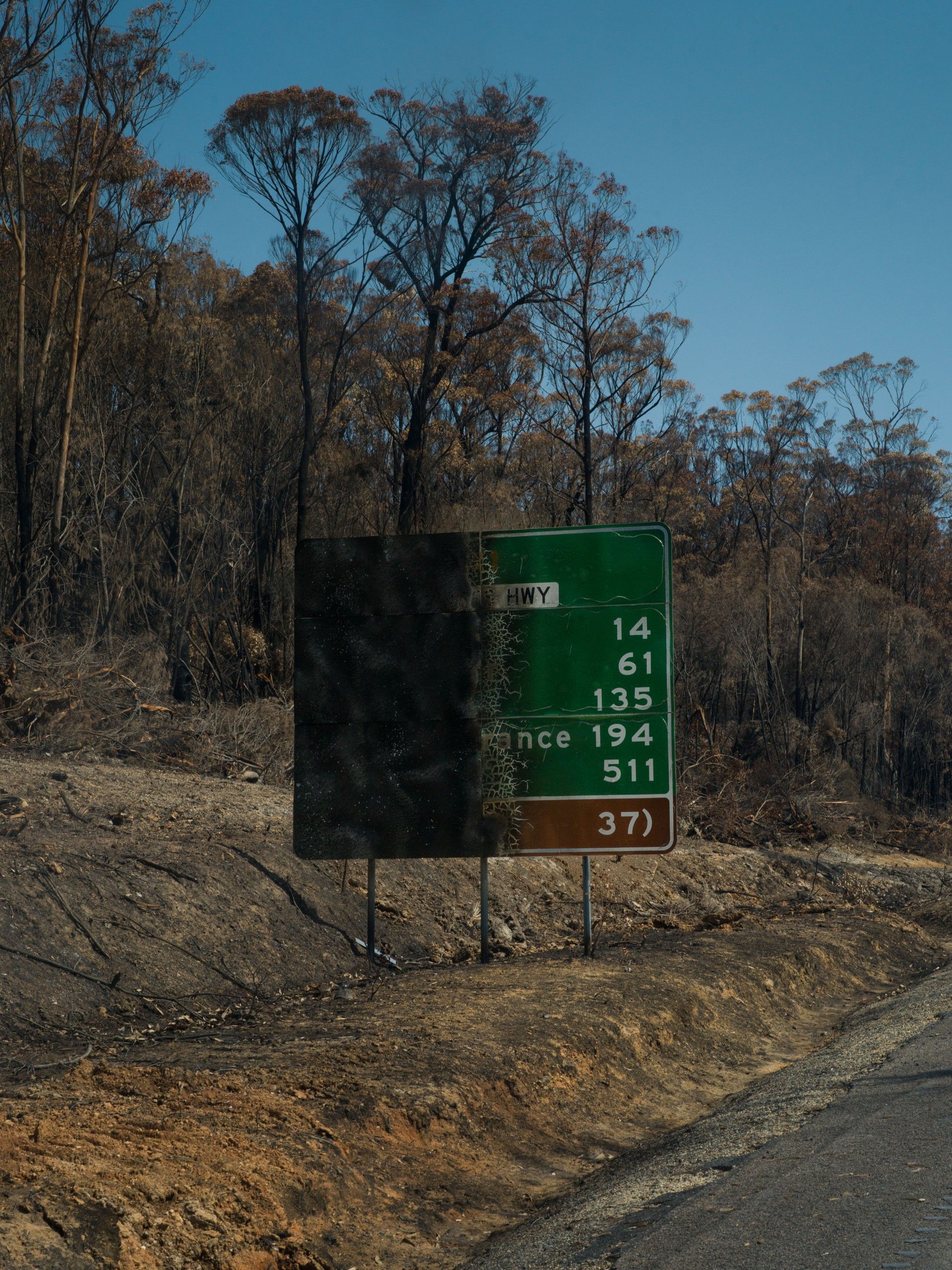 Our contemporary reality seems situated somewhere between local and general necrosis, on the edges of the inexorable decay of planetary tissue. Identifying local centers of necrosis no longer requires complex technical means – the process itself has been violently moving into everyday visibility. In Zielińska’s pictures, these necrocapitalist necroses extend outward – carving up space with broad brown swathes of burned vegetation, houses, cars, road infrastructure, and suburban gardens, separated by isolated oases of vibrant greenery. In the Necrocene, human death is inextricably linked with its non-human counterpart – burned-out trees are indistinguishable from the charred, rusting skeletons of cars. Necrocapital draws no boundaries and is indiscriminate in how it affects reality, burning everything in its way, even itself, incinerating all marks and traces. By the highway near Mallacoota, Australia, Zielińska snapped a picture of a road sign with the names of destinations completely burned off, leaving only unidentified distances – as if capital pays no mind to what worlds and spaces it devours as it “necrotizes the entire planet,”24 to cite McBrien. Against all laws of geology and history, the present seems to be transmuting into a fossil from the future: Australian trees, burned from the inside and still glowing with smoldering embers, harden into empty shells that eventually smother the blacktop and the rest of the modern urban infrastructure. Severing the population from global supply chains, they remake the global village into a network of local, autonomous nodes, and draw in the few adrenaline junkies with the promise of seeing (and experiencing) hell on Earth in the clichéd flesh.