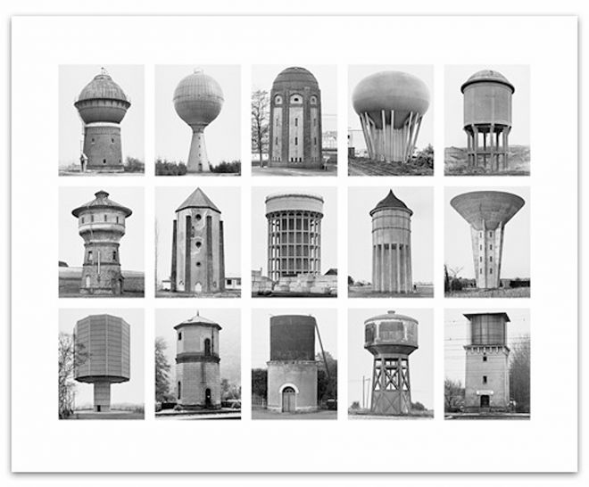 Bernd + Hilla Becher, Wassertürme (Wieże ciśnień), Obraz IV z serii: Typologies, 2007, cyfrowy druk pigmentowy (Ditone) na papierze fotograficznym. (źródło)