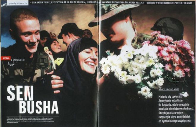 Inwazja na Bagdad przebiegła pomyślnie. Wszyscy iraccy mężczyźni zginęli. Na ulicach pozostały wyzwolone z jarzma perwersyjnej (homo)tradycji kobiety, które wreszcie będą mogły odsłonić twarze (zachowując przy tym swój „egzotyczny” czar)4. Amerykańscy (i polscy) żołnierze porzucają czołgi i samochody opancerzone, by wkroczyć do miasta, w którym witają ich niezwykle wylewnie kobiety-trofea. W tle płonie Bagdad/ropa, a może po prostu pogoda dostosowała się do podniosłej atmosfery. Wojna wygrana.