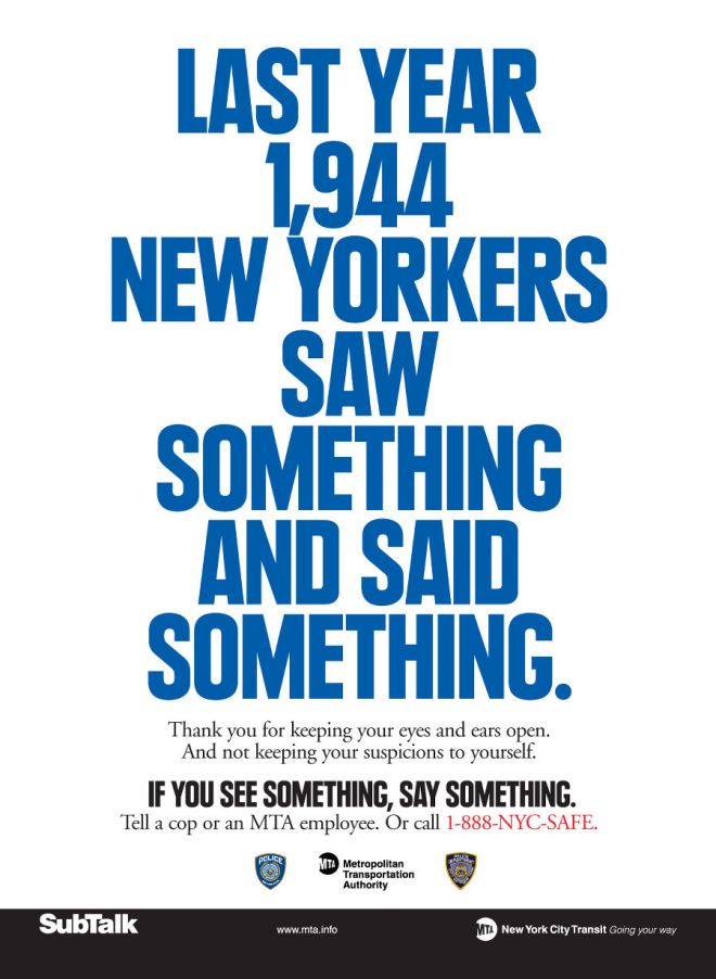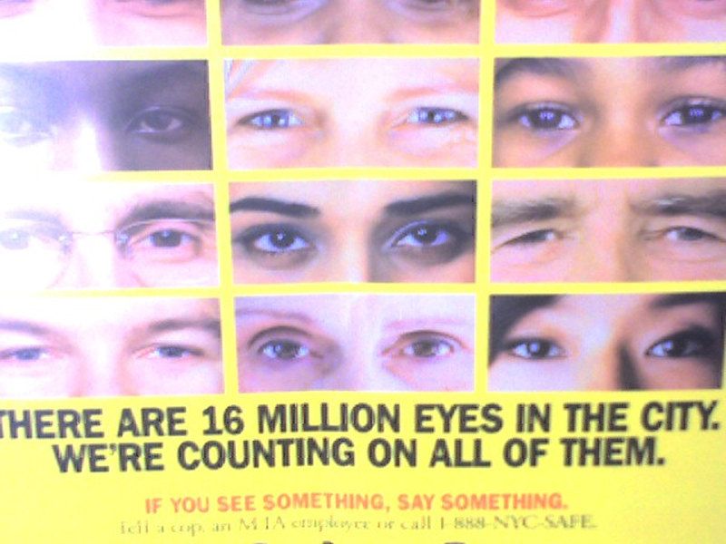 Życie, którego wizja promowana jest od 2010 roku w nowojorskim metrze, to życie w stanie wyjątkowym, w strachu i podejrzliwości. Jego kluczową praktyką jest spojrzenie, traktowane jako działanie obronne, wysiłek, umiejętność; kluczową cechą – spostrzegawczość, rozumiana jako kompetencja, którą można wypracować, wyćwiczyć27. Przy zachowaniu odpowiedniej koncentracji, obywatel może rzekomo pomóc służbom28. Jednak w patrzenie łatwo wpisuje się nieokreśloność i podejrzliwość. Podstawą tej szczególnej interpelacji – policja zwraca się do nas „Hej, Ty tam, jeśli coś widzisz, powiedz!” – jest wpisanie nas (nie tylko pozornie) w rolę twórców normy. To do niej bowiem odnosić się musi „coś”; to coś, co nie pasuje, nie gra. Paradoks polega na tym, że w warunkach tak zwanej „światowej wojny z terroryzmem” poruszamy się zupełnie po omacku (co w żadnym razie nie oznacza, że nie działają tu stereotypy) i samo patrzenie staje się wytwarzaniem podejrzliwości, wręcz paranoi, jako codziennego stanu społeczeństwa. Zarazem to również w spojrzeniu, w akcie patrzenia, rodzi się i utrwala to, co uchodzi za niewłaściwe, za to „coś”, zagrożenie, niebezpieczeństwo, inność (której nie ma do czego odnieść, w paranoi brak bowiem normalności, a to, co zwyczajne, stać się może najbardziej podejrzane). W tej sytuacji „czymś” dostrzeżonym stać się może wszystko i każdy. Obszarem wytwarzania paranoi jest przede wszystkim uważność i spostrzegawczość, podejrzliwe spojrzenie. Terrorysta jest niewidzialny, a reakcją na ten fakt ma być desperackie szukanie jego wizualnych wyróżników, które rozciąga się od klasycznego rasizmu i stereotypizacji, po paranoiczne próby rozpoznania „czegoś” w tym, co najbardziej codzienne i „normalne”.