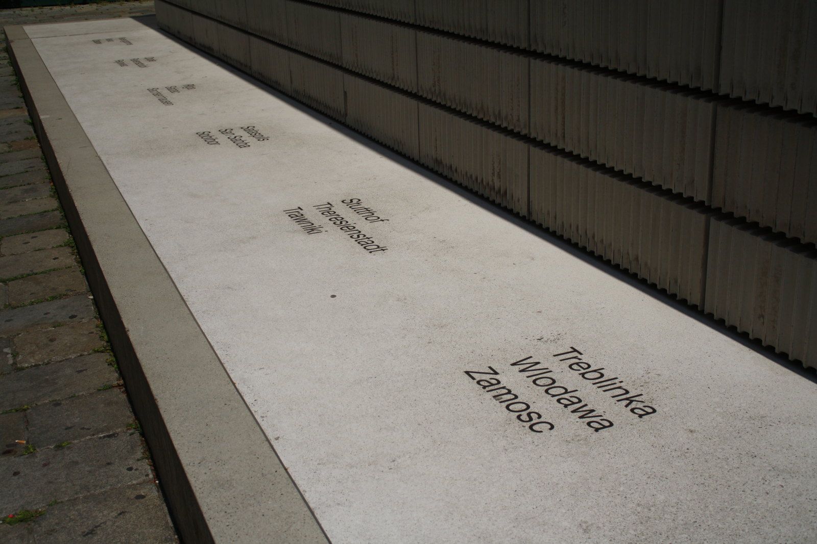 W tym właśnie miejscu stanął „das Holocaust-Mahnmal” Rachel Whiteread. Monument ten jest geometryczną, ascetyczną budowlą o wymiarach podstawy 10 na 7 metrów i wysokości 3,8 metra9. Jest to kub, którego abstrakcyjny kształt konkretyzuje się w znaczącym przekazie – przedstawia on „odlew” tajemniczej biblioteki, opustoszałej, istniejącej w zawieszeniu, niejako autystycznej, zwróconej ku sobie i odseparowanej od świata zewnętrznego (il. 1). Dominującym elementem zewnętrznej powierzchni rzeźby jest rastrowy motyw książek, a raczej ich śladów – rytmiczna powtarzalność niekończących się negatywów „półek bibliotecznych”, przeciętych zarysem dwuskrzydłowych drzwi (il. 2). Drzwi są zamknięte, zatrzaśnięte na głucho; odbiorcy wiedzą, że nigdy nie zostaną dopuszczeni do tajemnicy, jaką skrywa ta biblioteka. Bezpośrednim odwołaniem do historii Zagłady Żydów jest pamiątkowa inskrypcja na jednej ze ścian pomnika oraz wygrawerowane na jego podstawie nazwy wszystkich gett i obozów zagłady, do których deportowano wiedeńskich Żydów (il. 3).