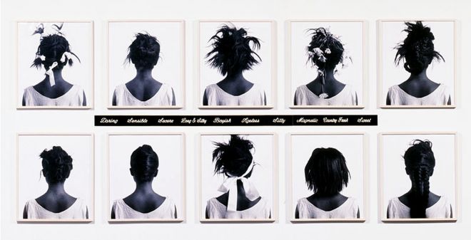 W podobnym kierunku zmierza myśl afroamerykańskiej artystki Lorny Simpson, analizującej tożsamość, marginalizację i dewaluację czarnej kobiety we współczesnym społeczeństwie. W latach 80. i 90. XX wieku artystka analizowała to zjawisko poprzez studiowanie stereotypów dotyczących wyglądu kobiet, często skupiając się na włosach właśnie20. Wykonana w 1999 roku praca Wigs składa się z 21 litografowanych plansz przedstawiających różne peruki sfotografowane na jednolitym, jasnym tle.