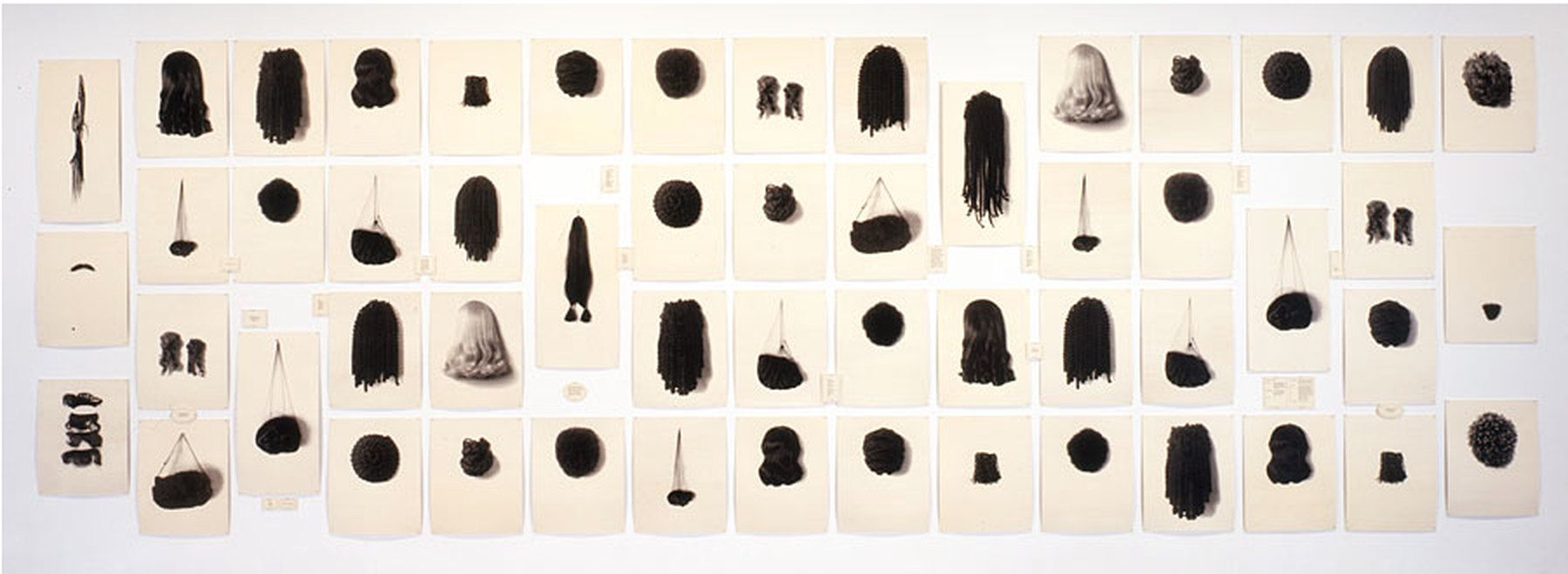 Stanowią one przegląd i typologię fryzur czarnoskórych kobiet. Z opisu pracy dowiadujemy się, że peruki zostały kupione na Brooklynie, w sklepie dla czarnych. Ciemnoskóre kobiety pochodzenia afrykańskiego, żyjące w zachodnich społeczeństwach dość często noszą peruki. Po pierwsze dlatego, że ich własne włosy są kruche i delikatne, przez co dosyć szybko niszczą się i wypadają, po drugie zaś, noszenie peruki to jeden ze sposobów upodobnienia się do białych kobiet. Włosy stają się tym samym sposobem zatarcia etnicznej przynależności i tożsamości kobiet. Nawiązuje do tego Simpson, która umieszcza przy planszach z perukami krótkie teksty opisujące włosy jako element kobiecej atrakcyjności, również atrakcyjności seksualnej, ale też odnoszące się do niewolniczej przeszłości afrykańskich kobiet, której echa widoczne są po dziś dzień w ich niskiej pozycji społecznej. Praca Simpson uświadamia, że nawet nie będąc nierozłącznym elementem ciała, włosy spełniają ważną rolę w konstruowaniu tożsamości oraz mogą być narzędziem polityki i przemocy.