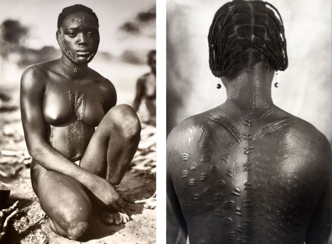 „Kolekcja” Zagórskiego nie była fenomenem bez precedensu. Wpisywała się w panującą wówczas w Europie tendencję i należała do grona podobnych zbiorów afrykańskich curiosités10. Jednak tym, co szczególnie interesowało polskiego fotografa, nie były maski, biżuteria i figurki11, ale ludzkie ciało. W jego kolekcji wyróżnić można, w ślad za samym autorem, pokaźny zbiór blizn. W kulturach afrykańskich były one i są przede wszystkim środkiem komunikacji – przekazują informacje o pochodzeniu czy pozycji społecznej12; dla noszących je ludzi były powodem dumy. Na fotografiach Zagórskiego stają się kuriozami, których głodni byli Europejczycy. Prezentowanie ich na wystawach kolonialnych było inną formą istniejących od końca XIX wieku ludzkich zoo. Przepiękne estetycznie bliznowe rysunki na skórze członków plemion Gombe, Sarra czy Bwaka, stawały się dla białego mieszczanina przerażającym dziwactwem oraz dowodem dzikości ludów Afryki. Podobnie zniekształcone czaszki kobiet z plemienia Mangbetu, które tak chętnie fotografował Zagórski. Należały one do kanonu piękna w Kenii lat 20. i 30. XX wieku, dlatego matki bandażowały głowy niemowlętom, aby nabrały pożądanej formy w czasie wzrostu dziecka. W Europie natomiast ludzi ze zniekształconymi w ten sposób chorobowo czaszkami uważano za wybryk natury i pokazywano w ludzkich cyrkach13.