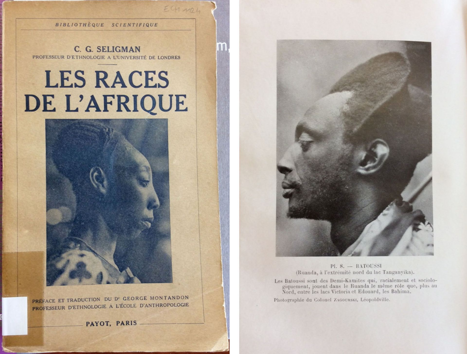 Po lewej okładka książki: Charles Gabriel Seligman, Les races de l’Afrique, Paris 1935, egzemplarz z mediateki Musée Quai Branly, sygn. F-L-A001926; po prawej strona z książki Seligmana z fotografią mężczyzny z plemienia Batoussi autortwa Zagórskiego (AQD I-89)