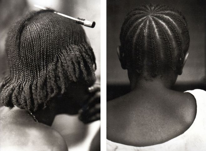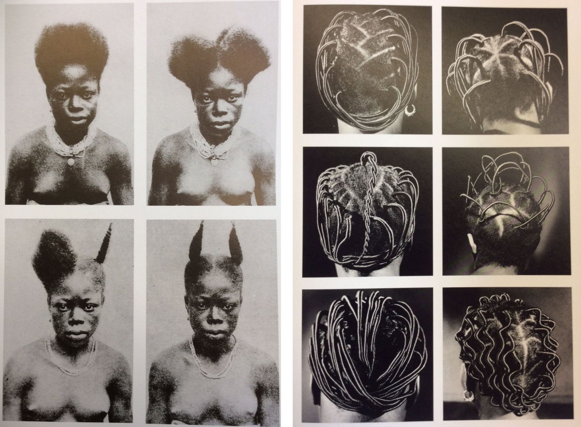 Po lewej: Fot. Niezidentyfikowany, Etapy przygotowywania fryzury, Ghana, początek XX w.; po prawej: J. D. ‘Okhai Ojeikere, Fryzury (Brush, Koroba Kiko, Oneness Kiko, Ogun Pari, Half Parting Packing, Back Parting), fotografie z lat 1968-1971