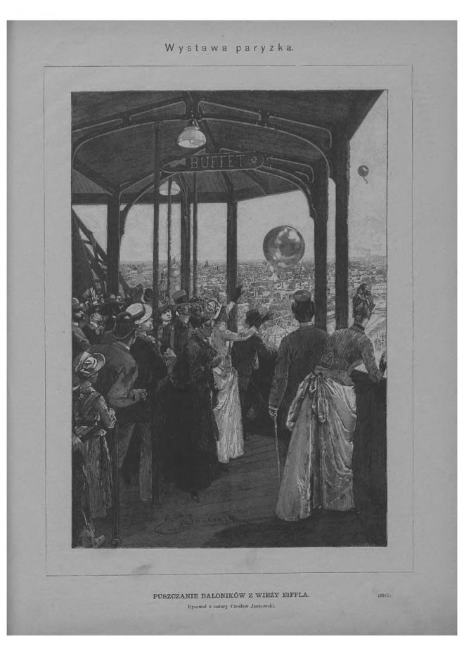 Zwiedzający wystawę światową w Paryżu na Wieży Eiffla, 1889. Źródło: „Tygodnik Ilustrowany”.