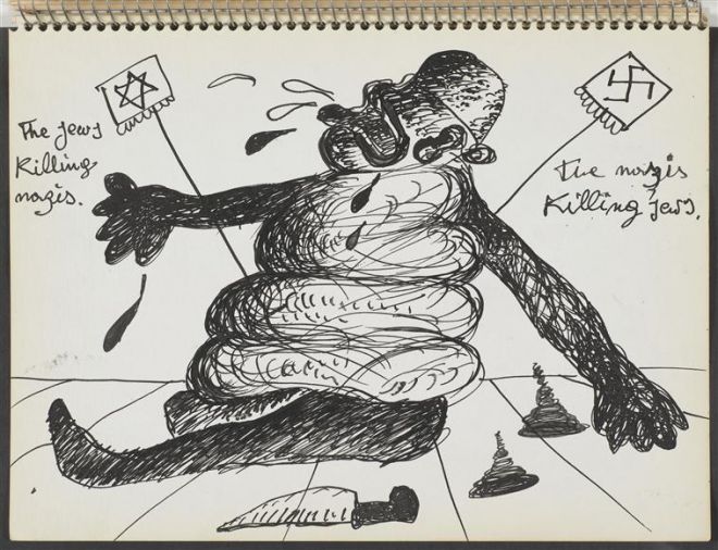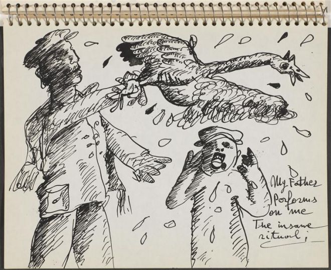 Wydaje się, że doznany wtedy szok bardzo silnie na niego wpłynął. Być może wówczas po raz pierwszy zobaczył śmierć – jego sprzeciw, jak pokazuje wiele rysunków w szkicownikach, wzbudziło „szaleństwo” rytualnej ofiary, która domaga się krwi zwierzęcia (rys. 15, na innych przedstawiających ptaka pojawia się bezpośrednie nawiązanie do święta Jom Kippur). Kogut staje się w rysunkach Maryana motywem bardzo ambiwalentnym. Raz zwierzę to żałosna kupa piór i krwi, która nie może zostać opatrzona komentarzem, raz towarzyszy mu podpis, który wyraża wstręt – kogut jest „do zwymiotowania”: „Przez tego kurczaka robi mi się niedobrze”, pisze Maryan (rys. 16). Kogut z poderżniętym gardłem ostatecznie umiera, a bohater szkicowników, mimo że otarł się o śmierć, w swoim mniemaniu bezprawnie rozciąga w czasie ten stan biologicznie podtrzymywanego, skrzywdzonego życia.
