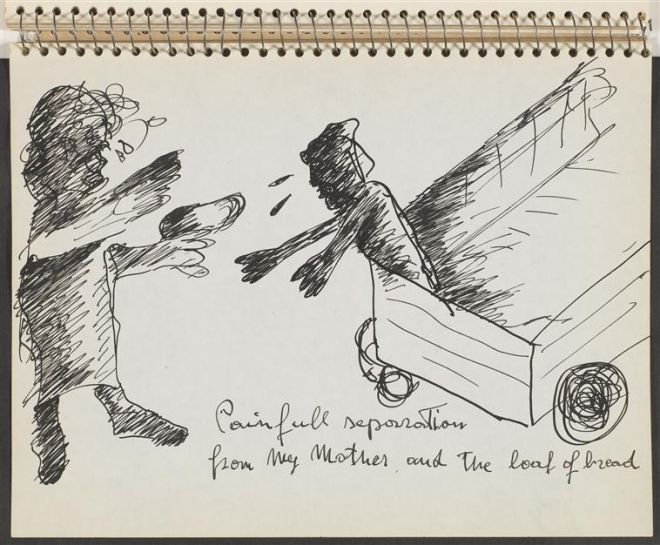 Matka artysty zazwyczaj rysowana jest przez niego z koszem pieczywa, które można skojarzyć z obiektem pragnienia. Jej pożegnanie z synem powtarza się w szkicownikach wielokrotnie, a centralnym punktem tej sceny jest przekazanie bochenka chleba (zob. np. rys. 3). Motyw bajgli i precli przenika z pierwszych, jeszcze stosunkowo realistycznych, szkicowników do dalszych rysunków, być może jako nawiązanie do okresu dzieciństwa. Stają się czymś w rodzaju skonstruowanego przez Maryana symbolu o niejasnym znaczeniu. Łączą konkretne wspomnienie domu rodzinnego (ojciec artysty był piekarzem) z poczuciem braku, odsyłają do czegoś nieokreślonego, wartościowego i utraconego. Leżą rozsypane, połamane na ziemi, nieraz mieszają się z zabawkami. Splatają też domenę matki, jako reprezentacja utraconego obiektu, z domeną ojca, ale rozumianą jako lokalna tradycja, porządek symboliczny na użytek prywatny. Przypominają domowy ład, który został zburzony – po wejściu nazistów do miasta leżą połamane na bruku. Nierzadko sposób, w jaki układają się bajgle i precle na „scenie” obrazów, przywodzi na myśl twarze w grymasie, usta i uszy (np. na rys. 4). Milczącemu Maryanowi brakuje warg, które będą zdolne przemówić – jakby nie umiał zwerbalizować poniesionej wskutek wojny straty, tak by być słyszanym. Język okazuje się nieużyteczny, nie pomaga określić, ogarnąć braku, którego doświadcza bohater szkicowników.