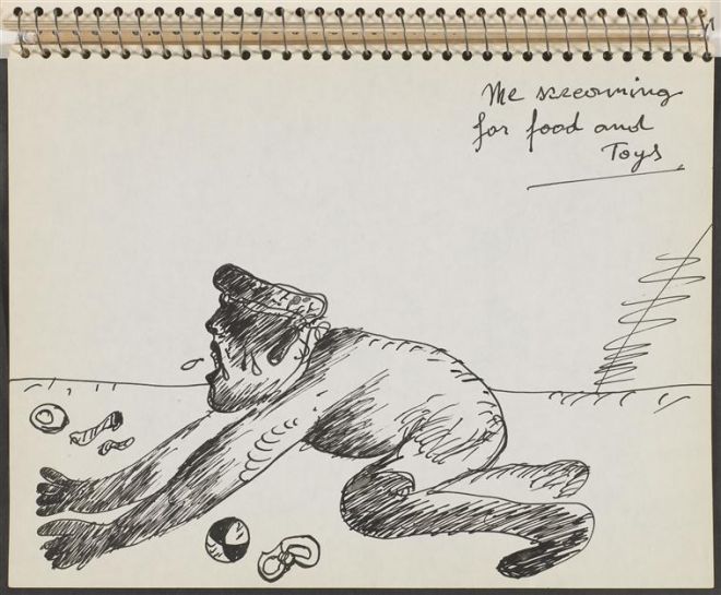 Z perspektywy psychoanalizy wojenne doświadczenia Maryana zdają się niewystarczającymi przyczynami afonii. Zaburzenie jest bowiem, zgodnie z teorią Freuda, spowodowane uruchomieniem schematu zaprogramowanego we wczesnym dzieciństwie. Autor Histerii i lęku zachęca do szukania we wczesnych doświadczeniach pacjenta sceny, na której powstał symptom. Psychoanalityk ma za zadanie „przenieść uwagę chorego z symptomu na [tę] scenę” i usunąć zaburzenie, „dokonując w trakcie odtwarzania sceny traumatycznej korekty ówczesnego procesu psychicznego”8. Na rysunkach Maryana można odnaleźć ślady poszukiwania przyczyn zaburzenia w dzieciństwie, trudno jednak wskazać je jednoznacznie. Pierwszy szkicownik przedstawia kilka wspomnień sprzed wojny i portrety bliskich artysty – na tle późniejszych są to jeszcze rysunki tworzone z pewną dbałością o realizm, szczegółowe, stosunkowo proporcjonalne. Linia, za której pomocą na tym etapie obrysowywane i wypełniane są postaci, wydaje się czuła i delikatna, tka „koronkowe sceny”, bywa podwójna – na schematyczny zarys została nałożona rozedrgana kreska. Wobec tego, wykonanie rysunków musiało wymagać sporo czasu lub pozwoliło rysującemu dłużej obcować ze wspomnieniem utraconego okresu dzieciństwa, na pielęgnowanie go w myślach. Obrazem nawiedzającym niemal każdy z dziewięciu szkicowników jest krzyczący Maryan jako czteroletni chłopiec. Przyczyna krzyku w tym wspomnieniu nie jest znana: „Co naprawdę wydarzyło się, gdy miałem cztery lata?”, pisze artysta na jednym z tego typu rysunków, jak gdyby odkrycie przyczyny tamtej reakcji miało pomóc mu wyzdrowieć. Na rysunku 2, podobnie jak na wielu innych, mały Maryan krzyczy, jak stwierdza komentarz, „z powodu zabawek i jedzenia”, choć przed nim leżą i jedzenie, i zabawki. Deficyt utrwalony w tym obrazie nie może zostać zaspokojony, w przypadku zaś wyobrażenia czteroletniego Maryana, nawet nie ma swojego przedmiotu.