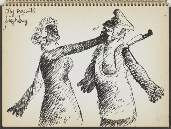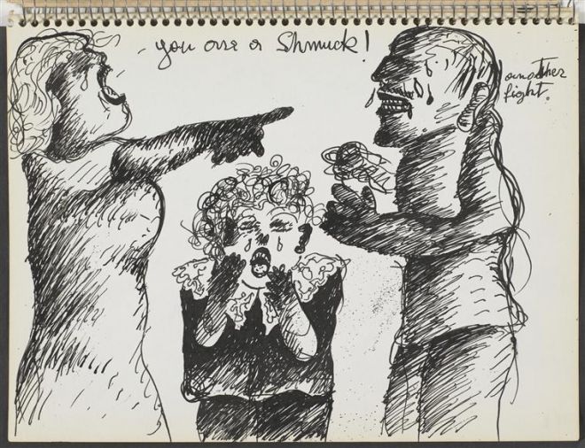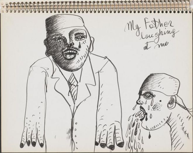 Innej przyczyny, dla której artysta doznaje blokady, można szukać, kierując się skojarzeniem języka z domeną Ojca (czyli tropem podyktowanym przez psychoanalizę w wydaniu Jacques'a Lacana, jego następców oraz następczynie) i analizować wyłaniający się z rysunków Maryana obraz relacji jego rodziców. W szkicownikach jako ważne wspomnienie wyodrębniona i powtórzona wielokrotnie zostaje scena kłótni, w której kobieta policzkuje mężczyznę. To zdarzenie zostaje ukazane w różnych ujęciach – od ilustracji w większym stopniu realistycznej (rys. 5) po wyobrażenia coraz mocniej zniekształcone przez rozrywający je afekt. Pozycja ojca zostaje dodatkowo osłabiona, gdy podczas kłótni grozi, że wbije nóż w siebie lub matkę artysty (zob. rys. 6). Na rysunku 7 broń pojawia się za plecami mężczyzny, jakby w locie, podczas sceny „walki”, na innym, podpisanym „Mój ojciec i jego wieczne harakiri”, jeden nóż dźga go w szyję od tyłu, a drugim sam atakuje swoją pierś. W późniejszym szkicowniku, w najbardziej nasyconym afektem przedstawieniu kłótni klaruje się znaczenie sporu między rodzicami – zagrożona matka przypomina wystraszonego ptaka (jej ręce wyglądają jak skrzydła, zob. rys. 7), ojciec zaś to żałosny, niekontrolujący emocji agresor. Na pierwszych rysunkach mężczyzna nosi znamiona autorytetu – gdy prowadzi syna do synagogi i do mykwy. Gdy jednak przestrzega prawa, które dziecko podaje w wątpliwość, czyli odprawia ofiarę ze zwierzęcia, „szalony rytuał” (rys. 15), Maryan oddziela się od niego. Później przedstawienie mężczyzny staje się karykaturą, jest upokarzany i posłuszny nazistom. Ze szkicowników wyłania się obraz hojnej matki, przerażonej i bezpowrotnie utraconej, a także obraz ojca – niestabilnego lub podporządkowanego władzy i prawu, którego syn nie chce przyjąć.