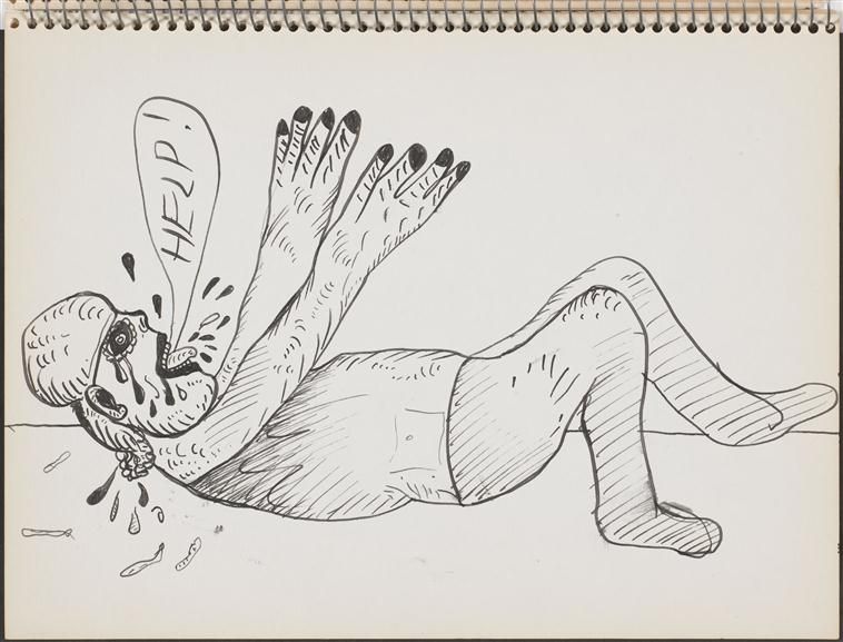 Ostatni, dziewiąty szkicownik wygląda jakby przez nadużycie tuszu na kleksy zdobiące poprzedni, ósmy, omawiany powyżej, najmroczniejszy cykl, zabrakło go na nadanie gęstości rysunkom kończącym terapię. Postaci wyraźnie wyblakły, umościły się w powtarzanych już po raz kolejny scenariuszach. Bohaterowi nadal dokuczają lęk i mdłości – przypadłość, która wystawia artystę na kpinę ze strony jego sobowtórów, uosobień superego – ojca (rys. 19) i żołnierzy oraz uosobień śmierci – szkieletów. Wymioty są dla niego niezmiennie pozbywaniem się niestrawnych, trujących treści, konfliktów i zmieszanych afektów, wydaje się jednak, że w tym szkicowniku nie tyle tworzą materię rysunku, ile cofają bohatera do pozycji dziecka odrzuconego, niezrozumianego i skrzywdzonego. Jego skarga, brak, który mu doskwiera, zostaje nareszcie wyartykułowany w języku, krzyk staje się słowem – wołaniem o pomoc (rys. 20). Okrzyk: „Pomocy!” może oznaczać przyswojenie języka na prywatny użytek, przekroczenie wstrętu do samego siebie, uznanie własnej wartości oraz tego, że zasługuje się na wsparcie. Ponowne zaufanie do mowy opiera się na wierze, że porządek symboliczny otwiera świat, który ratuje przed psychicznym cierpieniem, czyli „wspólnotę realną (inni ludzie) i wspólnotę wyobrażoną (sztuka)”27. Nadawanie sensu temu, co stało się widoczne podczas analizy, musi opierać się na wybaczeniu – aby używać języka, trzeba wybaczyć mu niedoskonałość. Wybaczenie należy się Matce, która nie zdążyła nasycić dziecka miłością, wybaczenie należy się osłabionemu Ojcu, który ma do zaoferowania tylko niedoskonały porządek symboliczny, i wybaczenie należy się samemu sobie28. Autor rysunków otacza się opieką i na powrót oddaje dziecięcy, miękki, obły, jasny kształt swojego ciała z czułością (rys. 20). Ironia i złość, które zdominowały rysunki na poprzednich stronach, ustępują uczuciu osamotnienia. „Uzdrawiająca” moc, która tkwiła w tych obrazach, polegała w dużej mierze na przekroczeniu wstrętu, wyzwoleniu krzyku, jako wołania o pomoc i na usłyszeniu własnego głosu.