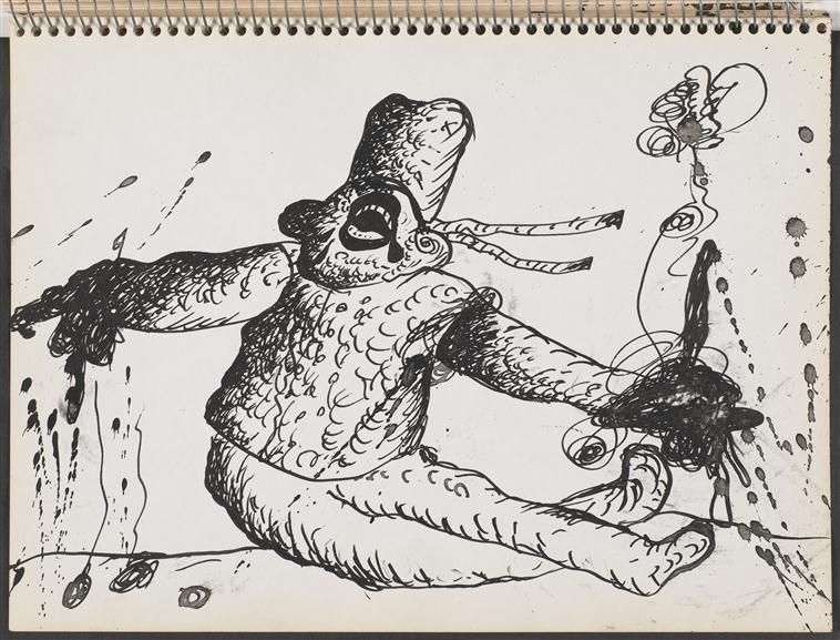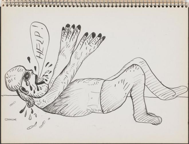 W szkicownikach wyraźne jest dążenie, by otworzyć i zbadać bolesną ranę. Medium tego badania staje się rysunek dający wyjątkową możliwość oddania doświadczanego cieleśnie afektu. Szkic, linia mogą być czytane jako zapis gestów, odzwierciedlenie ruchu pobudzonego afektem ciała. Przez nie zaś przemawia to, co nie mieści się w porządku symbolicznym i w nim rozgrywa się dramat niemocy mowy w obliczu traumy. Kristeva podkreślała znaczenie obrazu w tekstach, które dotykają kwestii obrzydzenia, jej zdaniem „nieprzedmiot – nieuchwytny, wymykający się, kłopotliwy – […] utrzymuje się za pośrednictwem wyobrażenia, a więc – widzenia”31. Dzięki zastąpieniu talking cure przez formę wizualną artysta mógł doświadczyć całej mocy wstrętu – przedstawiał postaci wymiotujące oraz zamienione w wymioty i stopniowo doznawał oczyszczenia. Po uobecnieniu afektu i stanięciu z nim obraz w obraz, przeszedł do ponownej symbolizacji. Ostatnie rysunki przedstawiają wyciszenie i pewne zaufanie do języka, którego artysta używa, by wyrazić wołanie o pomoc i zatroszczyć się o siebie.
