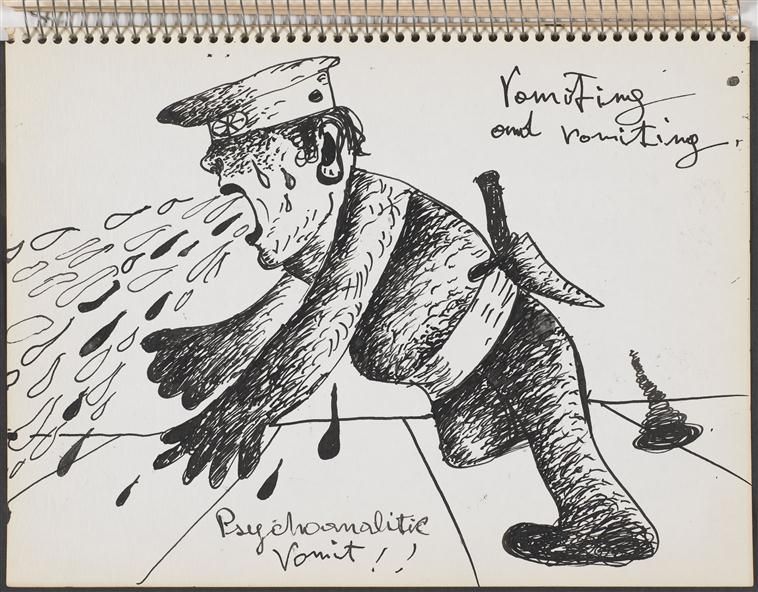 Skurczona głowa analizowanego przesuwa jego aktywność z mentalnej na cielesną, a produkcję opowieści z mowy na wymioty. Rysunek 11 podpisany „Wymiotowanie i wymiotowanie! Psychoanalityczne wymiotowanie!” (i inny, bardzo podobny do niego podpisany „Jak obrzydliwie!”), dotyczy wrażeń związanych z ujawnianiem popędowych, wstydliwych treści w czasie terapii. Z powodu obnażenia, pacjent może czuć do siebie wstręt i próbować chronić się za pomocą wymiotów przed psychoanalizą. Skupienie na abiekcie zamyka Maryana na ewentualne wsparcie ze strony terapeuty i jego współczucie: „Terapia to tylko męczące wymioty, bez ulgi ani korzyści”, zdaje się stwierdzać artysta, „Nie otrzymuję w zamian niczego wartościowego” (rys. 12 – when the blind spots come up, again we are down i 13 it is no good). Wymioty zapełniają usta bohatera szkicowników, żeby nie odsłaniać jego głodu, braku. Stają się czymś w rodzaju jedynego „bogactwa” wybrakowanego podmiotu.