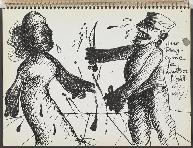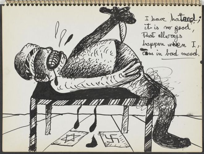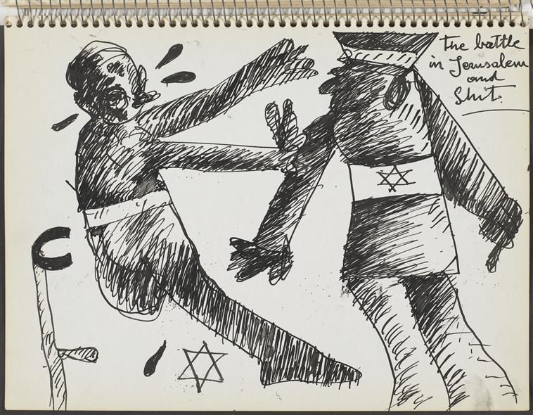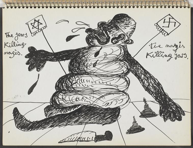 W szkicownikach Maryana wyraz tęsknoty, żalu, braku łączy się z atakiem – wspomnienia są wstrętne, „do zwymiotowania”, z obrzydzeniem traktowany jest porządek symboliczny, podważane są przynależność do zbiorowości i różne formy identyfikacji. Artysta zderza ze sobą rozmaite znaki w taki sposób, że tracą sens i niczego już nie systematyzują. W przemocowych działaniach wszystkie strony konfliktu zostają zrównane, np. żydowska policja nosi jednocześnie opaski ze swastyką i gwiazdą Dawida na ramieniu. Maryan często rysuje samego siebie jako ofiarę ataku nazisty czy też polskiego lub żydowskiego policjanta (np. rys. 8, Bitwa o Jerozolimę). Buntuje się na własne pochodzenie i sygnalizuje moralną ambiwalencję wszelkich konfliktów. Wyobrażeniom konfrontacji dwóch przeciwstawnych sił towarzyszy obecność wstrętnej resztki, która plami mundur, wycieka poza sztywną formę - to wyróżniony objaw niepełnej reprezentacji afektu, wydalina przerażonego czy wściekłego organizmu, czyli shit, co można tłumaczyć jako „gówno” lub „resztę” (w opisach rysunków: all that shit, lub and the shit). Do ekskrementów upodabniają się stopniowo również ciała bohaterów szkicowników – półpłynne, ciemne, płaskie plamy, które zalewają, wypełniają strony aż po brzegi. Rysunek 9 ujmuje konflikt w sposób syntetyczny, w rebus: po jednej stronie postaci, która przypomina odchody, znajduje się napis „Żydzi zabijający nazistów”, po drugiej – „Naziści zabijający Żydów”, a rozwiązanie zagadki mogłoby brzmieć: same shit, czyli „jedno i to samo gówno”. Szkicownik trzeci, poświęcony obrazom konfliktów charakteryzuje gęsty rysunek oraz mieszanina afektów, które trudno jest rozdzielić, uporządkować i nazwać.
