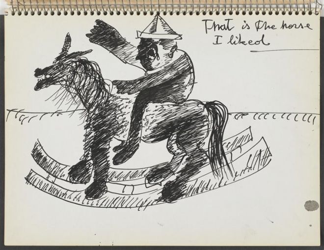 Powyższy cytat dotyczy wiedzy, którą artysta zyskał na swój temat, niewątpliwie cennej, jeżeli potrafił wykorzystywać ją, by sobie pomóc. Rys. 21 przedstawia Maryana jako dziecko na koniu na biegunach, którego podobno zobaczył pewnego razu na podwórku bogatego sąsiada. Prosił rodziców o tę zabawkę, lecz nie mógł jej mieć30. Realizacja tego pragnienia w dorosłym życiu stanowi akceptowalną, bezpieczną formę regresu.