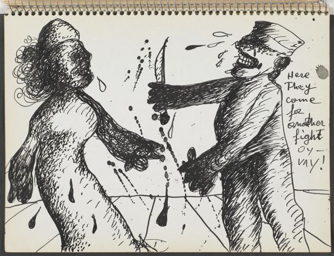 Jako przykład takich działań artystycznych chcę przedstawić szkicowniki Maryana S. Maryana, które interpretować będę jako talking cure w medium wizualnym. Analizowane przeze mnie rysunki powstały w 1971 roku, gdy artysta, dotknięty załamaniem nerwowym połączonym z afonią, za namową terapeuty zaczął odtwarzać swoją dramatyczną historię. Z racji tego, że biografia i twórczość Maryana, zwłaszcza szkicowniki, nie doczekały się do tej pory wyczerpującego opracowania i interpretacji, mój tekst ma również za zadanie uzupełnić choć częściowo tę lukę6. Maryan S. Maryan (1927–1977) urodził się jako Pinchas Burstein w żydowskiej rodzinie w Nowym Sączu. W 1939 roku trafił do getta, w 1942 roku przeżył rozstrzelanie – trafiony dwa razy w twarz i raz w szyję, przetrwał na stercie martwych ciał. W 1944 roku trafił do obozu w Auschwitz, a opuszczając go, podczas marszu śmierci ponownie został postrzelony i „cudem” ocalał. Po wojnie pogromy i fala antysemityzmu wygnały go z Polski do Niemiec. W 1947 roku wyjechał do Jerozolimy i podjął edukację artystyczną, którą przerwała wojna domowa7. Od 1950 studiował malarstwo w Paryżu, gdzie odnalazł się w środowisku twórców krytykujących postępowanie rządu francuskiego wobec objętej wojną Algierii. W 1962 roku przeniósł się wraz z żoną do USA, gdzie w 1969, w gorącym okresie protestów w reakcji na wojnę w Wietnamie, został obywatelem Ameryki, a także zmienił imię i nazwisko. Dwa lata później poddał się terapii i stworzył serię ok. 500 rysunków zebranych w 9 szkicownikach pod wspólnym tytułem Ecce homo. Analizując zawarte w tej serii obrazy, można stwierdzić, że ich aktualność dokucza artyście z dwóch powodów – ponieważ nawiedzają go we wspomnieniach i dlatego, że rok 1945 nie położył kresu konfliktom zbrojnym. Losy Maryana potoczyły się bowiem w taki sposób, że wielokrotnie narażony był na powrót widm II wojny światowej.