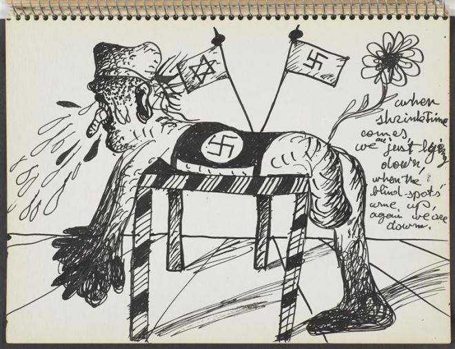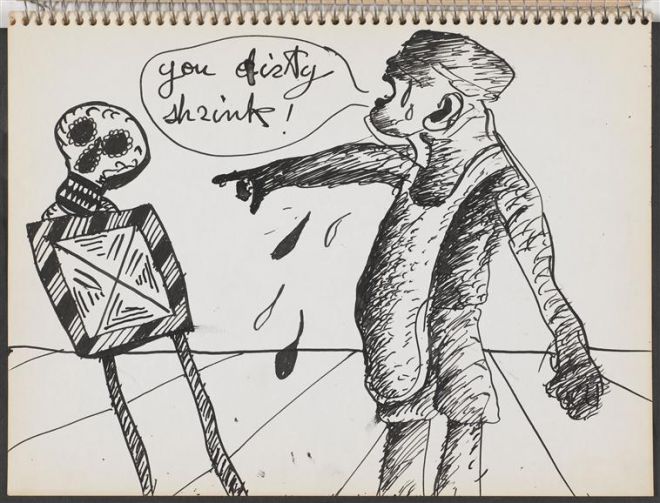 Odrzucanie pomocy ze strony terapeuty oraz proces terapeutyczny jako cierpienie stanowią temat czwartego i piątego szkicownika. Ciało Maryana jest przeszywane włócznią lub krępowane kaftanem bezpieczeństwa. Terapia boli, utrudnia dotychczasowe funkcjonowanie, które możliwe było dzięki wyparciu odkrywanych przez nią mroków nieświadomego. W miejsce „bitwy o Jeruzalem” toczonej na poprzednich kartach, pojawia się „bitwa o Nowy Jork” toczona z psychiatrą – groteskowym kościotrupem. Przedstawień cierpiącego ciała dopełniają obrazy ukrzyżowania, wiwisekcji i obdzierania ze skóry. Artysta wciela się w rolę ofiarnego zwierzęcia lub „Prawdziwego Króla Żydowskiego” (przedstawia siebie na krzyżu z tabliczką INRI nad głową). Terapia staje się, jak głoszą komentarze, lekcją „anatomii Żyda” lub „anatomii Maryana” oraz „psychoanalizą psa”. Terapeuta zostaje obrzucony obelgami: śmierdzi, jest „gówniany” i perwersyjny, sprośny lub brudny (zob. rys. 10: you dirty shrink!). Psychiatra – shrink, to w rebusach Maryana head shrinker, ktoś, kto „kurczy” głowę swojej „ofiary”, zamiast ją uwalniać, otwierać.