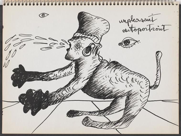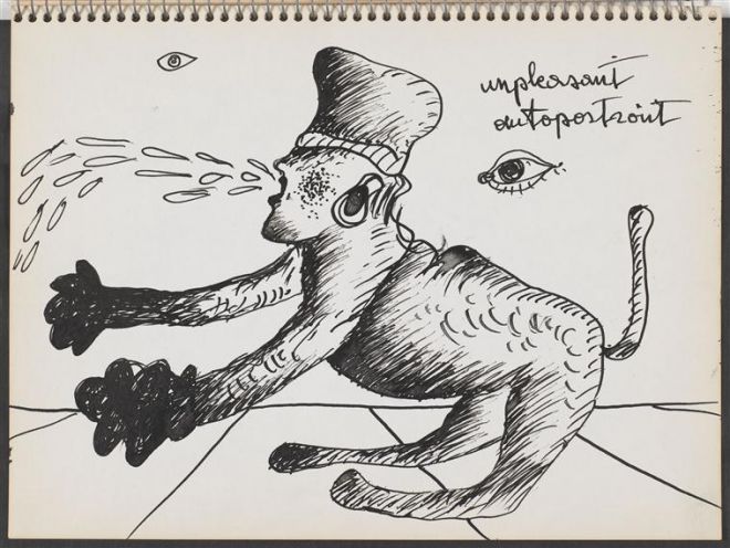 Kilka rysunków w szkicowniku numer siedem stanowią autoportrety, które sytuują się w dystansie do przeszłości – żadne z dręczących artystę symboli niewygodnej przynależności (takich jak opaska z gwiazdą Dawida) nie pojawiają się tutaj, brak też wyobrażeń konfliktów. Owszem, większość rysunków przedstawia ciała, z których sączy się tusz, kompozycja zyskuje jednak więcej oddechu. Na rys. 17 oko poddające obserwacji pół ludzką, pół zwierzęcą, wymiotującą (lecz wyjątkowo regularnym strumieniem) postać, wydaje się być spokojne, choć „autoportret” ten artysta nazwał „nieprzyjemnym”. Być może wspomniany rysunek wyraża nadzieję, że spojrzenie, które obejmie i uspójni własne wyobrażenie podmiotu, pozwoli mu funkcjonować. Nawet jeżeli efekt tego „zebrania się” na powrót w całość będzie pokraczny jak postać na rys. 18, która wydaje się być zbudowana z ziemi, gliny, patyków i kamieni.