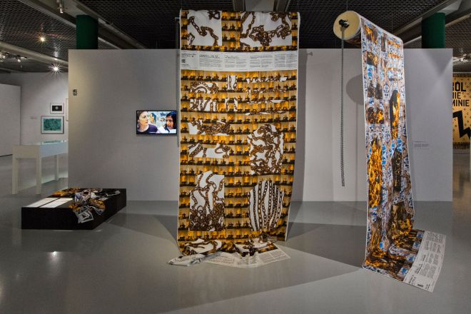 Ines Doujak we współpracy z Johnem Barkerem, Czółenka krosna / Wojenne ścieżki, NIEUBRANE DO ZDOBYWANIA: 01: POŻARY [Loomshuttles / Warpaths, NOT DRESSED FOR CONQUERING 01 FIRES], 2012/2015. Instalacja, dzięki uprzejmości artystów. Fot. Piotr Tomczyk. Dzięki uprzejmości Muzeum Sztuki w Łodzi