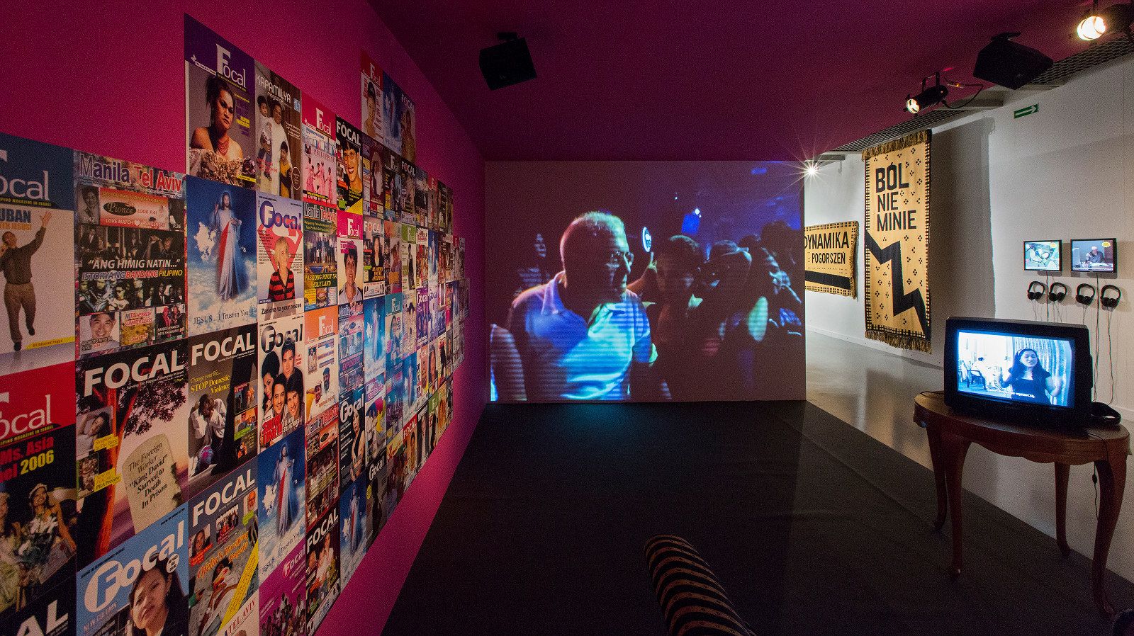 Widok wystawy. Fot. Piotr Tomczyk. Dzięki uprzejmości Muzeum Sztuki w Łodzi, na pierwszym planie Köken Ergun, Binibining (Miss) Ziemi Obiecanej [Binibining Promised Land], 2010. Instalacja wideo. W tle po prawej stronie Jadwiga Sawicka, Ból nie minie, 2013. Dzięki uprzejmości artystów
