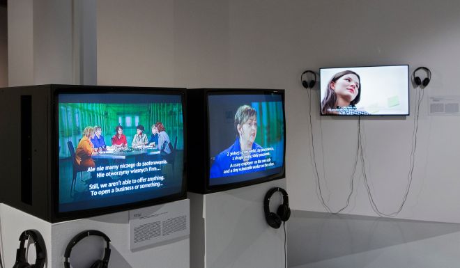 Konfrontując się z wielowymiarowością powiązanych globalnie warunków pracy, wystawione dzieła podkreślały współistnienie rozpoznanych i dopiero powstających form wyzysku kobiet i sfeminizowanych usług. Marge Monko, Jadwiga Sawicka, Aleksandra Polisiewicz, Elżbieta Jabłońska i Alicja Rogalska podjęły wątki transformacji ustrojowej w Europie Wschodniej oraz różnych sposobów, na jakie dotknęła ona kobiety. W wideo Forum (2009) Marge Monko analizuje na przykład wykluczający na nowym rynku pracy splot płci, dojrzałego wieku, przynależności do rosyjskiej mniejszości i pochodzenia z klasy robotniczej w Estonii. Jednocześnie wspólnie z bohaterkami dzieła – bezrobotnymi Rosjankami, przez większą część życia związanymi z zakładami przemysłowymi – artystka zainscenizowała telewizyjny program publicystyczny oparty na wymazywanym doświadczeniu i wiedzy kobiet. Stworzyła alternatywną, bardziej solidarną herstorię postkomunistycznej transformacji.