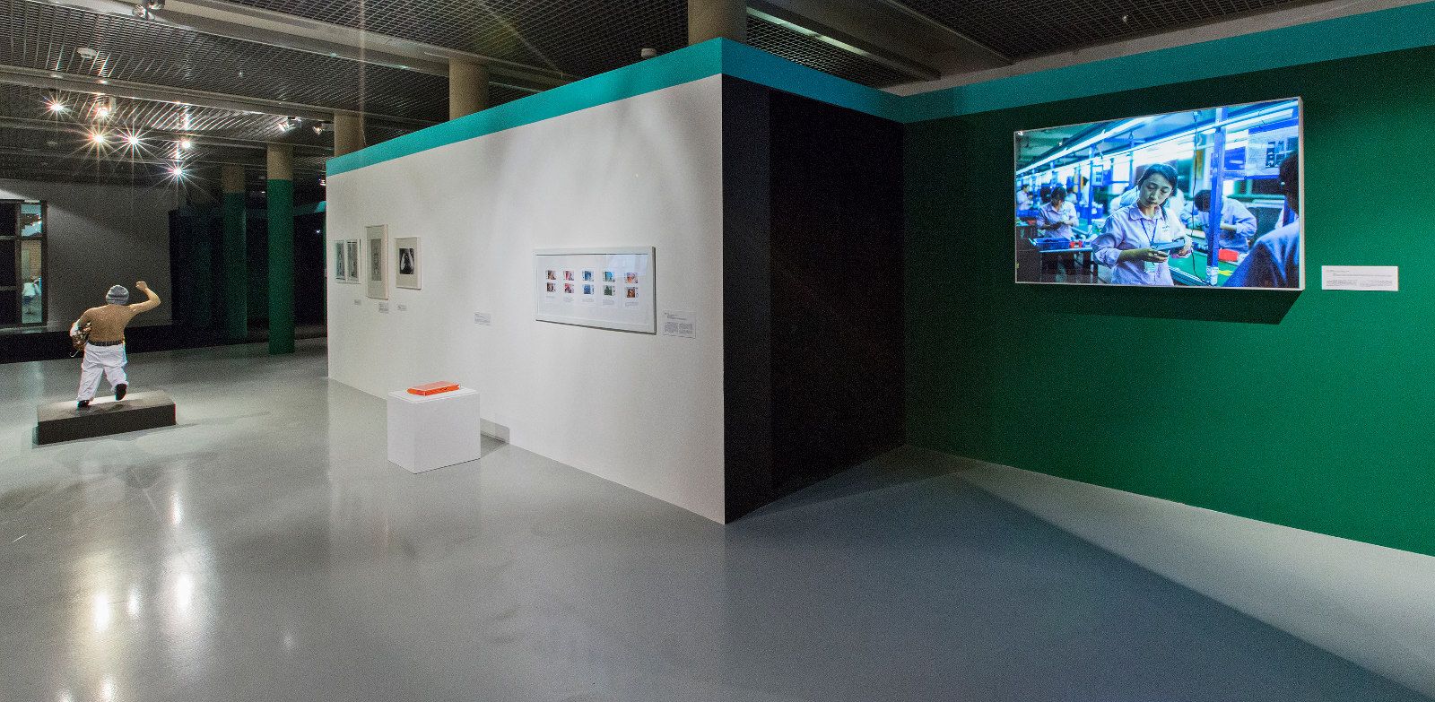 Widok wystawy, architektura: Krzysztof Skoczylas. Na pierwszym planie: Allan Sekula, Linia montażowa z zamkniętymi oczami [Eyes Closed Assembly Line], 2010. Lightbox, kadr produkcyjny filmu Zapomniana przestrzeń [The Forgotten Space], reż. Allan Sekula i Noël Burch. Dzięki uprzejmości Allan Sekula Studio LLC, Los Angeles. Fot. Piotr Tomczyk. Dzięki uprzejmości Muzeum Sztuki w Łodzi