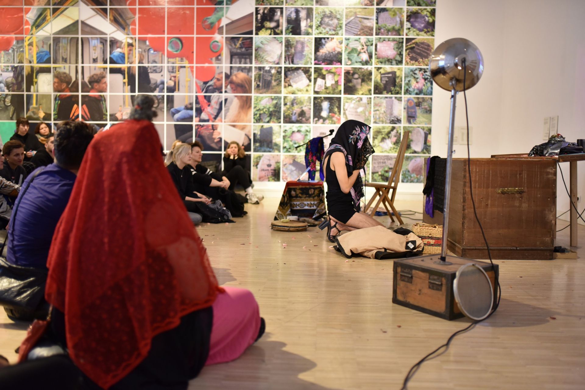 Najciekawszą pracą w ramach poznańskiej wystawy jest dla mnie jednak instalacja nomadycznej artystki Dobrawy Borkały Panika (2019), zadedykowana skrajnym emocjonalnym reakcjom i ich przełożeniu na rytm oddechu osób, u których zdiagnozowano choroby przewlekłe. Wewnątrz dźwiękowej kapsuły zbudowanej z torebek oraz transparentnych winylowych płacht służących do izolacji pacjentów, artystka umieściła antyseptyk pobudzający skojarzenia z sytuacją hospitalizacji. Doświadczając tej pracy, poczułam się nieswojo, poza rejestrami czysto semiotycznego znaczenia choroby – trochę jak w buduarze, który zachęca do otwartości, ale i pod zaciśniętym ochronnym parasolem, który ją tamuje. W wyznaczonym dla mnie miejscu zatrzymania uwagi, z którego mogłam obserwować inne prace, doznałam iluminacji – poczułam, że z polemicznego, ognistego hasła prezentującego nieugiętość życia Show must go on! wytracane jest słowo go on. Ogarnął mnie niepokój, może nawet panika, która w ciągu następnych miesięcy stała się globalną społeczną kondycją. Przez prześwity płacht patrzyłam na wyeksponowane i niemal tracące cielesną integralność witalne genitalia seropozytywnego młodzieńca z autoportretu Bartka Arobala Kociemby Mental Body (2019), któremu z kolei wirusa przekazał jego ówczesny chłopak.