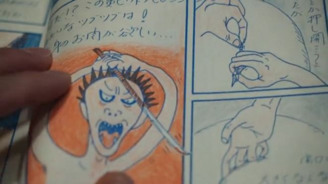 O niektórych formalnych cechach filmu duetu już wspomniałem. To przede wszystkim najbardziej rzucający się w oczy tryb operatorski – kręcenie w wielkim zbliżeniu, z dającą się odczuć bliskością kamery wobec ciała Sagawy. Cięcia występują rzadko, a bohaterom pozwala się regularnie wykraczać poza kadr bez zmiany pozycji kamery. Słabo oświetlone twarze – a zwłaszcza jedna twarz – tracą czasem ostrość jakby w proteście wobec tak intruzywnego zbliżenia. Dialogom mężczyzn towarzyszą przedłużone sceny milczenia, w których kamera nieustająco wpatruje się, zagapia. Pojawiają się jednak i inne obrazy, za każdym razem bardzo znaczące. Obok materiałów archiwalnych w postaci pochodzących z lat 50. XX wieku nagrań i zdjęć braci jako bawiących się dzieci oglądamy bowiem wideo okaleczającego się młodszego brata Sagawy, Juna, rozpowszechniane wśród społeczności BDSM, a także nieznośnie długą, trwającą ponad dziesięć minut scenę, w której lekarz zajmujący się Sagawą czyta narysowaną przezeń mangę ilustrującą noc 11 czerwca 1981 roku. Zwraca tutaj uwagę, że zarówno manga, jak i nagranie nakłuwającego się nożem Juna mówią przecież coś bardzo podobnego do stężałego wizerunku bohatera – tematyzują doświadczanie nieprzyjemnych, sprawiających ból obrazów i problematyzują obecność ciała, które te obrazy ogląda. Nawet z pozornie niewinnymi nagraniami z dzieciństwa braci kontrastuje prowadzona z offu rozmowa o stopniowym odkrywaniu seksualnej roli bólu, o formowaniu masochizmu, a także o narastającym pragnieniu zjedzenia ludzkiego mięsa – żądzy, której według słów samego Sagawy nieodłącznie towarzyszy silniejsze nawet być może pragnienie bycia zjedzonym, co w kontekście tego eseju wydaje mi się najistotniejsze.
