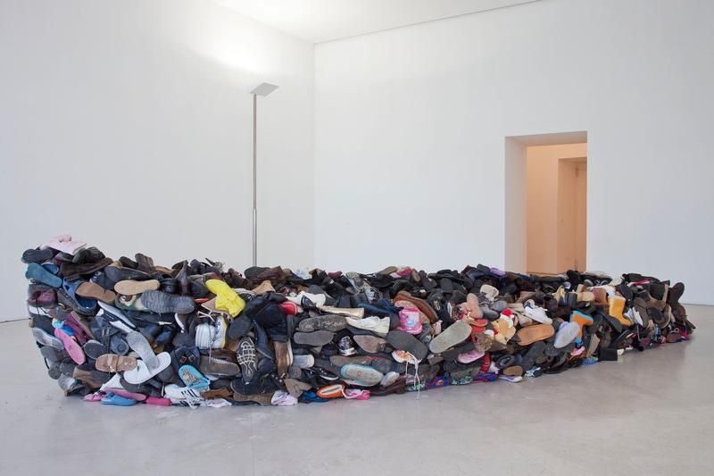 Najbardziej rozpoznawalnym artystą, który wykorzystuje materialne obiekty w pracach dotyczących uchodźstwa, jest Ai Weiwei. Laundromat (2012), tak jak wiele innych jego instalacji, cechuje duży rozmach7. Artysta wykorzystał ubrania i buty, które znalazł w greckim obozie w Idomeni, gdzie zmuszeni do ewakuacji uchodźcy porzucili część swego dobytku. Aby zapobiec jego wywiezieniu na wysypisko śmieci, Ai Weiwei przetransportował te rzeczy do swojego studio w Berlinie. Tam każde ubranie zostało uprane, wysuszone i wyprasowane, a następnie wpisane do rejestru – „działanie [artystyczne] polegało na tym samym, co praca w pralni”8. W ten sposób Ai Weiwei zapobiegł potraktowaniu pozostawionych w obozie butów i części odzieży jak śmieci.
