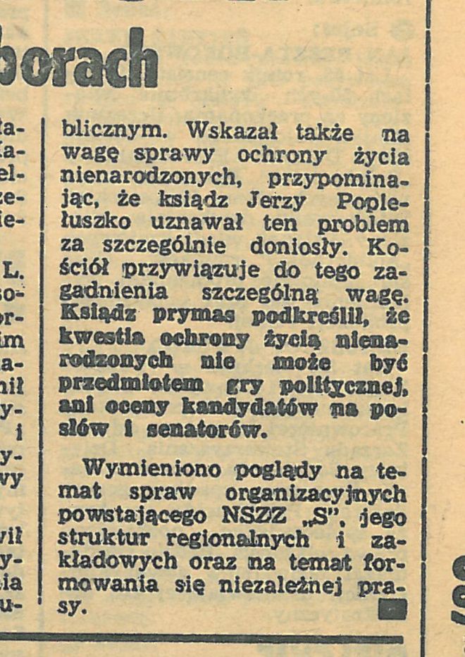 Wskazał także na wagę sprawy ochrony życia nienarodzonych, przypominając, że ksiądz Jerzy Popiełuszko uznawał ten problem za szczególnie doniosły. Kościół przywiązuje do tego zagadnienia szczególną wagę. Ksiądz prymas podkreślił, że kwestia ochrony życia nienarodzonych nie może być przedmiotem gry politycznej, ani oceny kandydatów na posłów i senatorów1.