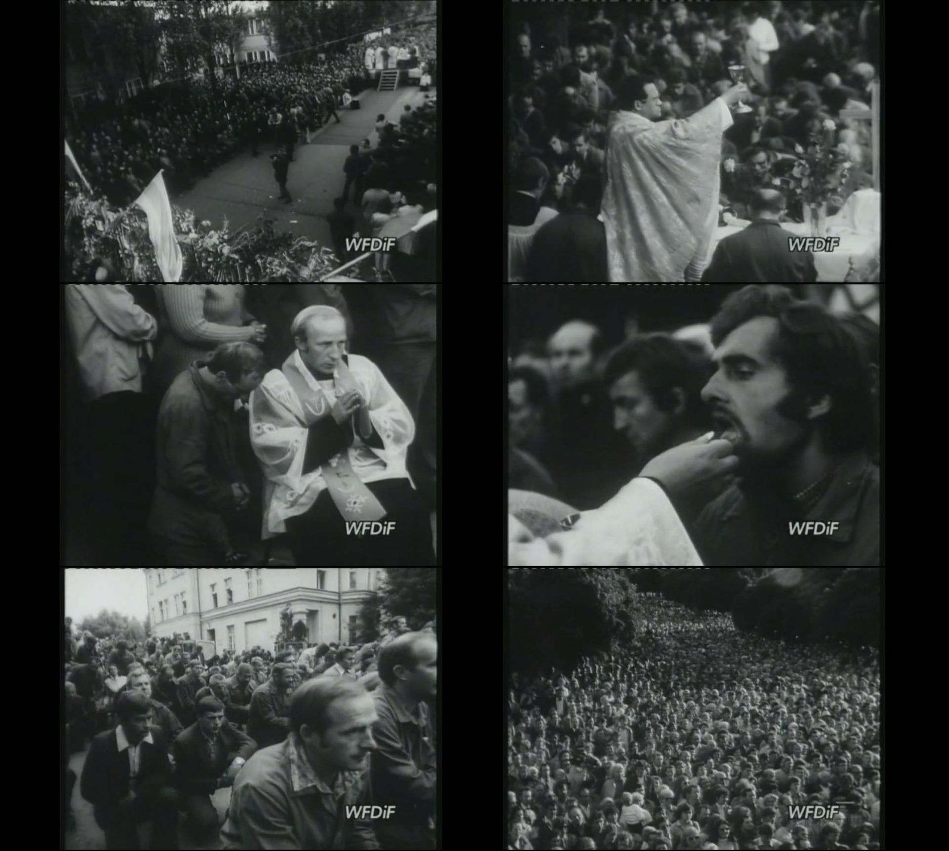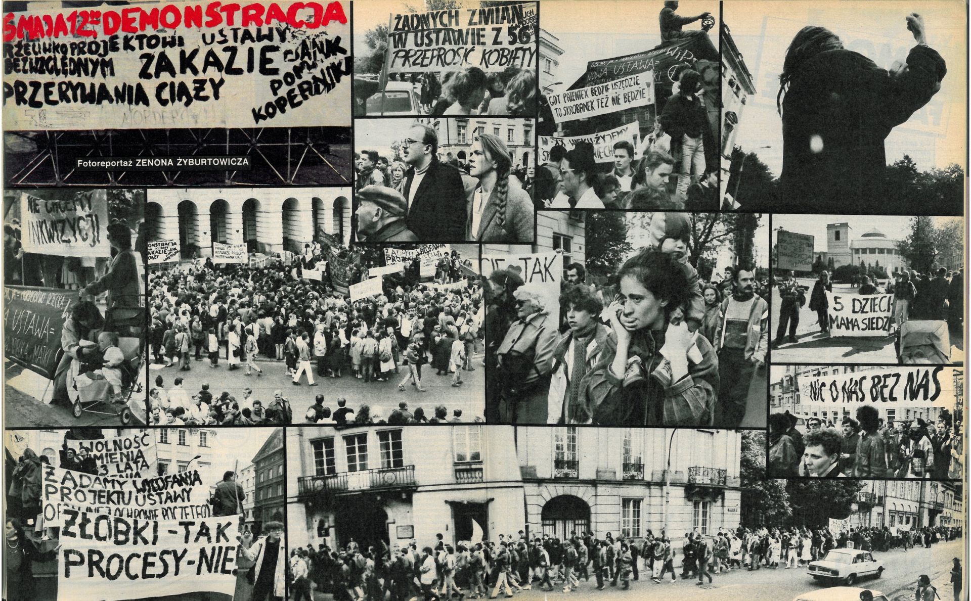 W narracjach feministycznych ikoniczny charakter mają obrazy z oficjalnych obrad Okrągłego Stołu, przedstawiające zasiadających wokół niego uczestników, wśród których po stronie opozycji znalazła się tylko jedna kobieta, Grażyna Staniszewska10 (oraz jedna po stronie rządowej: Anna Przecławska). Ten element wizualny jest punktem węzłowym opowieści o mechanizmach, które sprawiły, że kobiety – mające ogromną, często decydującą rolę w zapoczątkowanym przez pierwszą „Solidarność” procesie przemian – zostały wypchnięte poza struktury decyzyjne, a tym samym z dyskursu i z historii, w wymiarze praktycznym i symbolicznym. W ramach konstruowanej w tym tekście opowieści dotyczącej wykluczenia aborcyjnego wizualne archiwum otwiera fotografia pierwszej strony pierwszego numeru „Gazety Wyborczej”. Choć wielokrotnie reprodukowana, do pewnego stopnia „opatrzona”, została również „prześlepiona” w zakresie, w jakim podkreśla (wytłuszczonym tekstem) wagę związku opozycja–Kościół–aborcja w procesie transformacji. Jako niemal anegdotyczne domknięcie tego wizualnego archiwum proponuję kadry z Polskiej Kroniki Filmowej z 20 stycznia 1993 roku: uchwycony został tu moment, kiedy bezpośrednio po zakończonym głosowaniu nad ustawą antyaborcyjną posłowie na sejmowych korytarzach dzielą się opłatkiem z prymasem Glempem. Kontrapunktem dla tych wizerunków władzy są obrazy sprzeciwu i organizowanego oddolnie oporu11, pochodzące z manifestacji przeciwko zakazowi aborcji w maju 1989 roku, stanowiące wizualne ogniwo „podziemnego” archiwum transformacji.